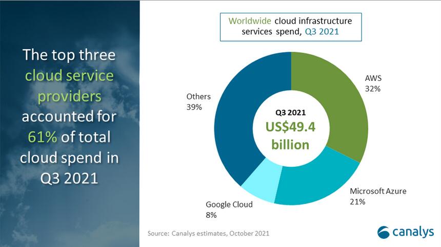 2021年第三季度,亚马逊网络服务(AWS)占云基础设施服务总支出的32%,成为领先的云服务提供商,年增长率为39%。AWS最近发布了AWS for Health,它将特定行业的产品与网络安全和合规性解决方案结合起来。