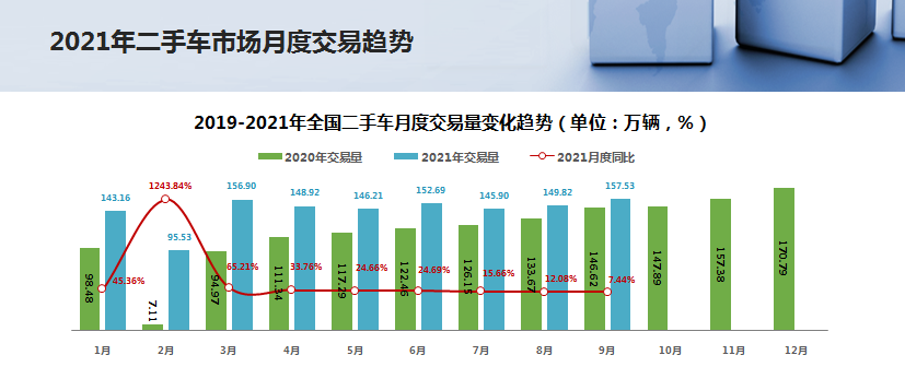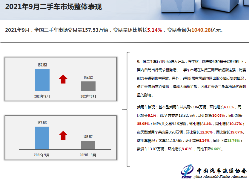 2021年9月,全国二手车市场交易量157.53万辆,交易量环比增长5.14%,交易金额为1040.28亿元。