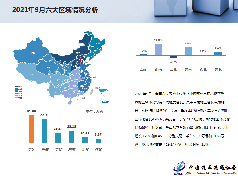 10月是二手车市场旺季,第三周日均交易6.41万辆,环比增长3.86%,与9月第三周相比增长1.4%。本周的交易量走高主要来自于南部地区的带动,中南西南等重点地区交易量均呈现两位数的增长。