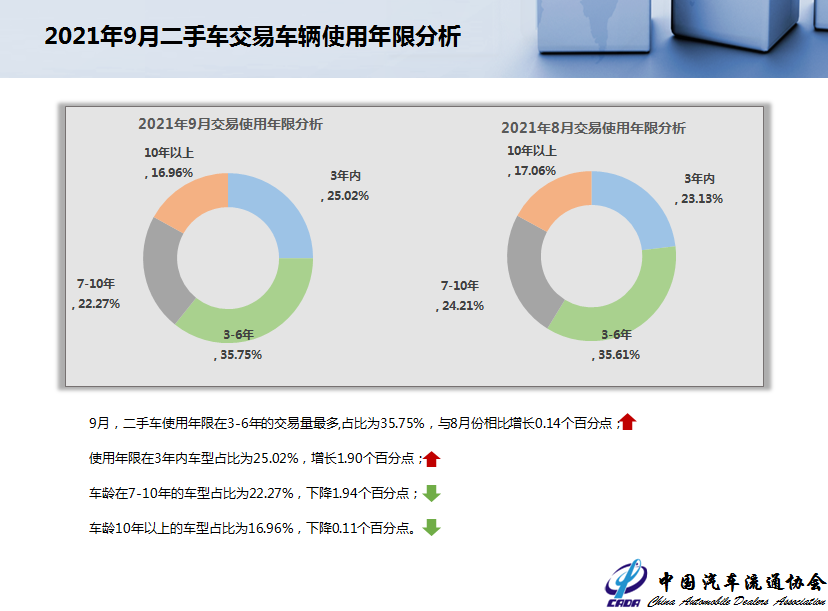9月,二手车使用年限在3-6年的交易量最多,占比为35.75%,与8月份相比增长0.14个百分点。