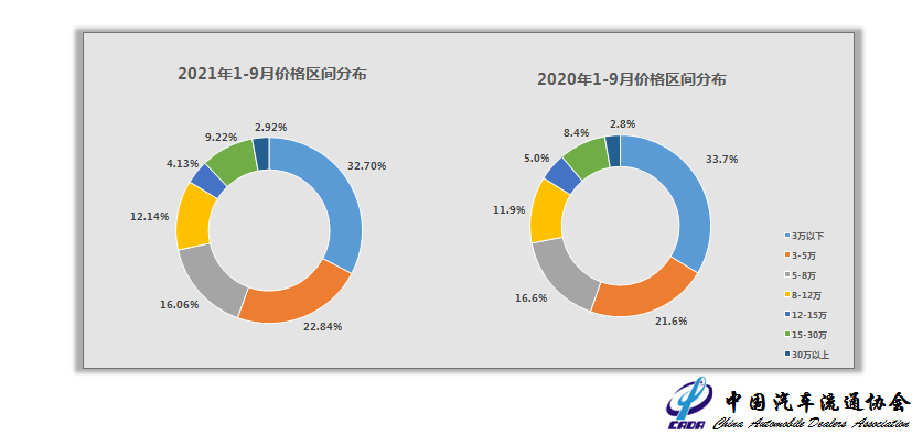2021年1-9月二手车价格区间分布:3万元及以下价格区间的车辆下降1.01%,3-5万区间增长1.20%,5-8万区间下降0.54%,8-12万区间增长0.20%,12-15万区间下降0.83%,15-30万区间增长0.83%,30万区间以上增长0.15%。