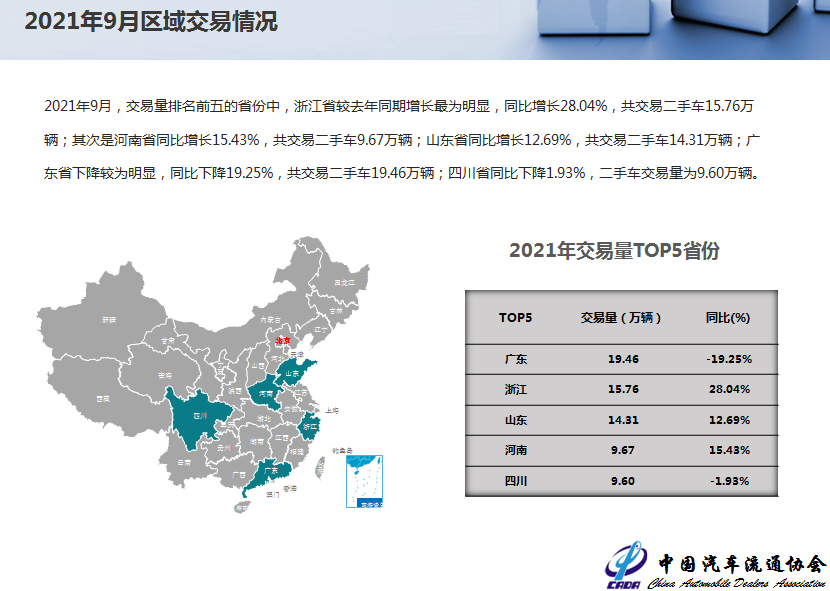 今年第三季度,二手车交易量为453.26万辆,较去年同期增长11.52%,同比增速与2020年相比增加了2.36个百分点。三季度在经历了疫情的反复叠加各地极端恶略天气的影响仍然保持两位数的增长,说明二手车市场自身的韧性及支撑力都较强。全年预计达到1600万辆的交易规模。