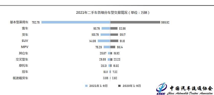 2021年1-9月,全国二手车市场累计交易量1296.68万辆,同比增长35.34%。其中;基本型乘用车共交易782.75万辆,同比增长37.34%;客车98.79万辆,同比增长18.22%;载货车108.79万辆,同比增长22.01%;SUV 141.86万辆,同比增长55.58%;MPV 75.29万辆,同比增长34.12%;交叉型乘用车29.55万辆,同比增长27.22%。