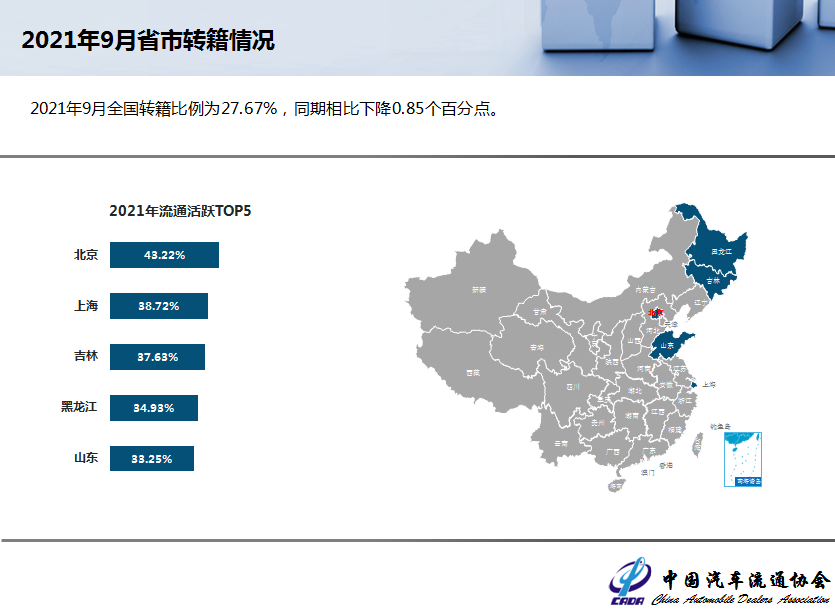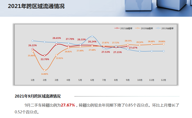 9月二手车转籍比例为27.67%,转籍比例较去年同期下降了0.85个百分点。环比上月增长了0.52个百分点。