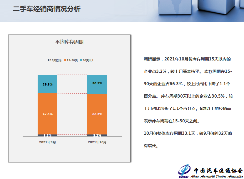 调研显示,2021年10月份库存周期15天以内的企业占3.2%,较上月基本持平。库存周期在15-30天的企业占66.3%,较上月占比下降了1.1个百分点。库存周期30天以上的企业占30.5%,较上月占比增长了1.1个百分点。6成以上的经销商表示库存周期在15-30天之间。