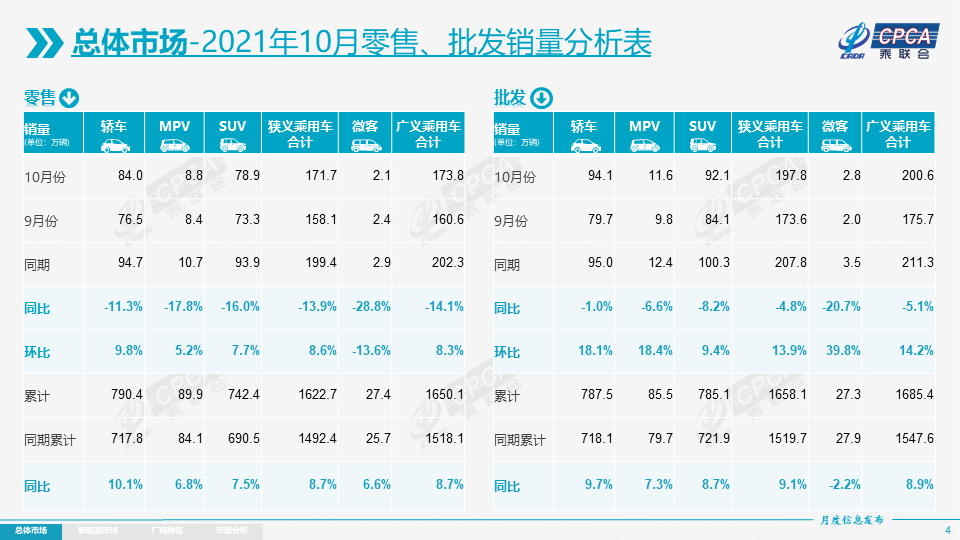 今年1-10月的零售累计达到1622.7万辆,同比增长8.7%,较1-9月增速下降3个百分点。增速摊薄的原因主要是2020年7-10月零售高基数的影响。今年1-10月同比增量124万辆中新能源车增量157万辆,占总增量126% 对1-10月同比增速贡献了10个百分点。