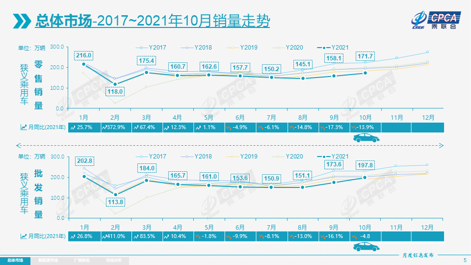 零售:2021年10月乘用车市场零售达到171.7万辆,同比下降13.9%,相较2019年10月下降7%,10月零售总体不强。