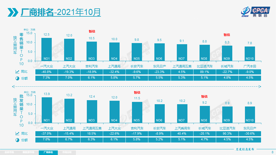 10月主流合资品牌零售77万辆,同比下降24%,环比增长12%,相对2019年10月下降19%。10月的日系品牌零售份额22.6%,同比下降1.4个百分点。美系市场零售份额达到8.7%,同比下降0.9个百分点。法系份额改善,德系品牌供给在逐步改善。