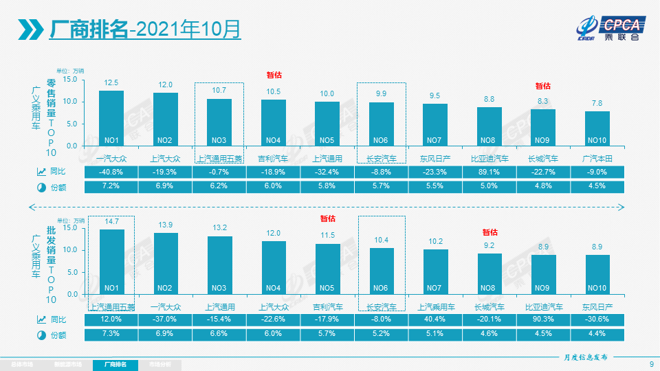 10月自主品牌零售77万辆,同比增长4%,环比增长11%,相对2019年10月增长9%。自主品牌国内零售份额为45.6%,同比增8个百分点。批发市场份额47.8%,较同期份额增长了7.4个百分点。且自主品牌头部企业产业链韧性强,有效化解芯片短缺压力,变不利为有利,在新能源市场获得明显增量,因此比亚迪、上汽乘用车等传统车企品牌同比均呈高幅增长。