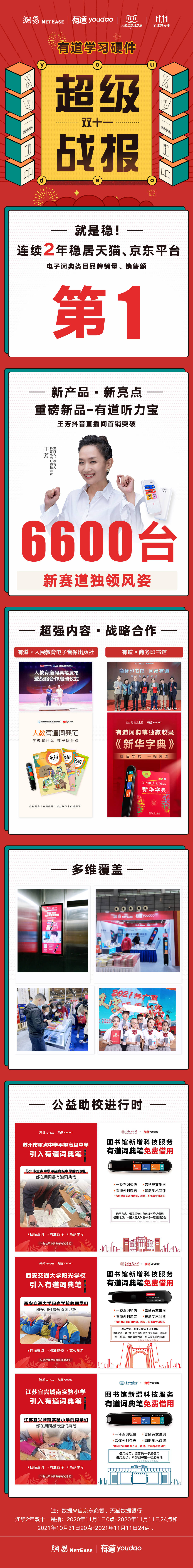 同时,网易有道今年新推出的AI听力口语练习机——网易有道听力宝,初次亮相双十一即获开门红,与知名主持人王芳合作,抖音直播首销即售罄,销量突破6600台。