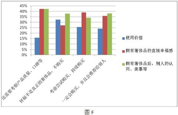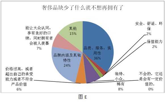 (2). 但是,即使是能带来更大心理满足的奢侈品,消费者最不能舍弃的还是最最本源的实用性! 图E中可以清楚看到,商品的品质、服务及其实用性是最多消费者选择不能缺少的,其次才是奢侈品最引以为豪的品牌。