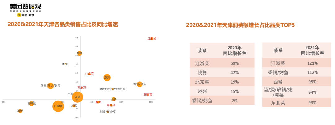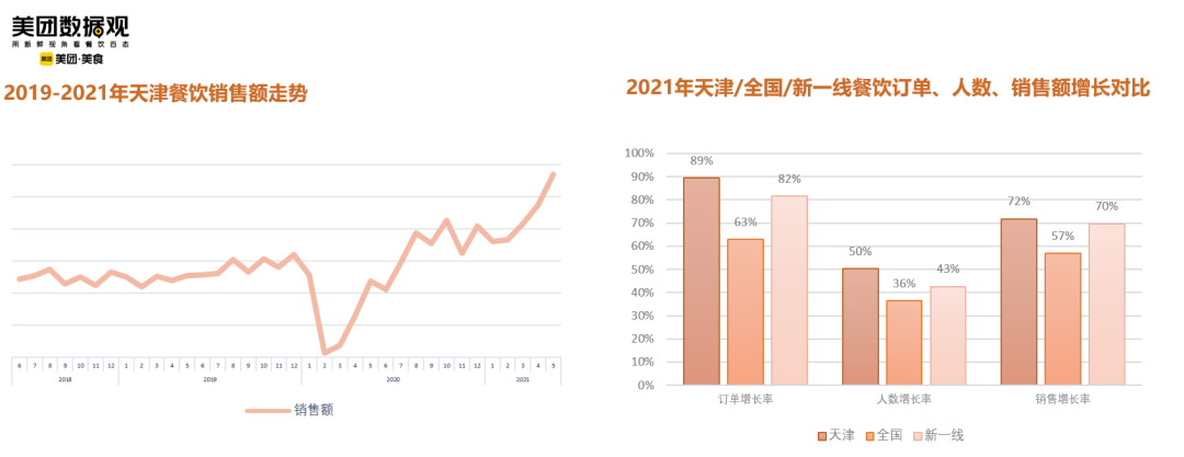 疫情过后,天津人到店就餐需求迅速提升,餐饮消费增速超过全国与新一线城市。美团数据显示,2020年天津全市社会消费零售额增长18.7%,其中餐饮业营收达到495亿元,同比增长27.1%。