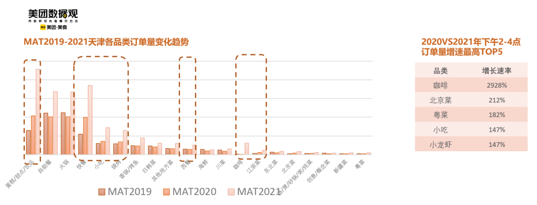 在疫情过后,「走食」成为新风尚。美团数据显示,从MAT2019-2021天津各品类订单量变化趋势来看,蛋糕/甜点/饮品成为增长最快的品类,下午茶(14:00-16:00)时段增速最快;下午茶咖啡订单量增长将近30倍,京菜、粤菜轻食下午茶为消费者提供多样选择。
