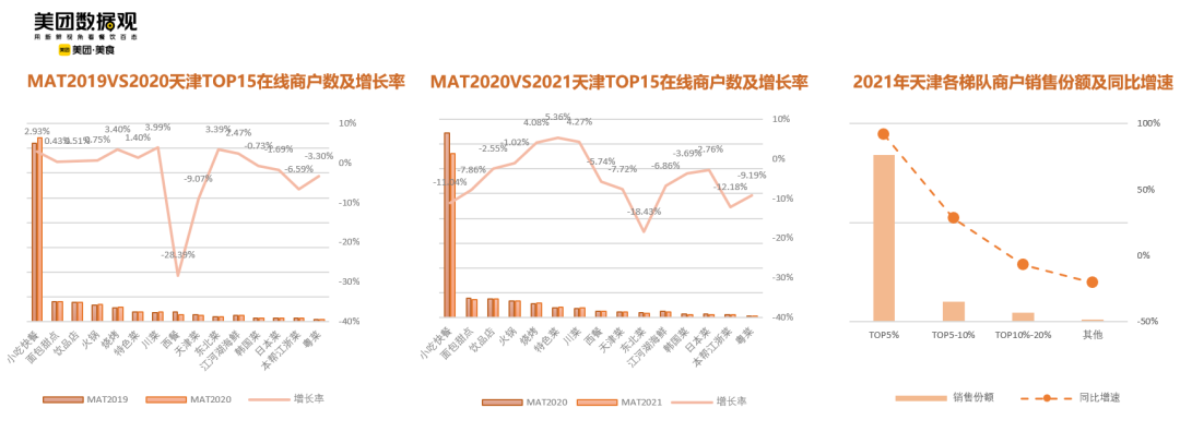 美团数据显示,MAT2019-2020,餐饮商户从线下转移到线上阵地,线上化进程被加速推进;MAT2020-2021,餐饮线上竞争加剧,头部商户优势逐渐扩大。