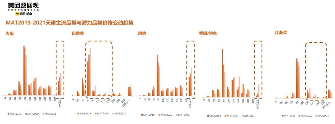 美团数据显示,从MAT2019-2021主流与潜力品类的价格变动趋势看到,近三年,天津消费者对高单价商品的接受度提高,更愿意为品质买单,消费观念逐渐改变。