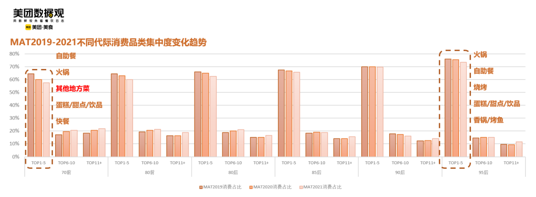 与其他代际相比,美团数据显示70前与95后消费者增长更快,近两年70前人数翻番,95后在2021年占比超35%,拥有巨大消费潜力。商家需要关注其喜好与消费习惯的变化,抓住下一个风口红利。
