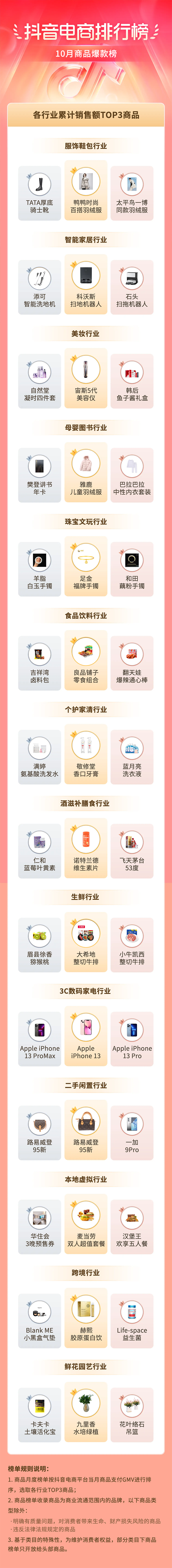 10月榜单分为商品爆款榜、品牌榜、店铺榜,梳理14大行业赛道TOP3商品、品牌及店铺,发现应季爆款单品和热门店铺,助力品牌及商家洞察消费市场趋势与消费者偏好。接下来,让我们来具体看一看,刚过去的10月,哪些商品、品牌和店铺榜上有名!