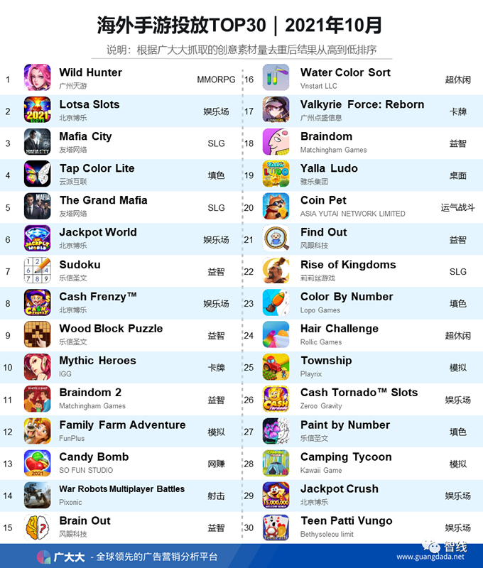 海外手游投放 Top 30(2021.10)|来源:广大大。注:Family Farm Adventure 属于点点互动公司,而非 Funplus
