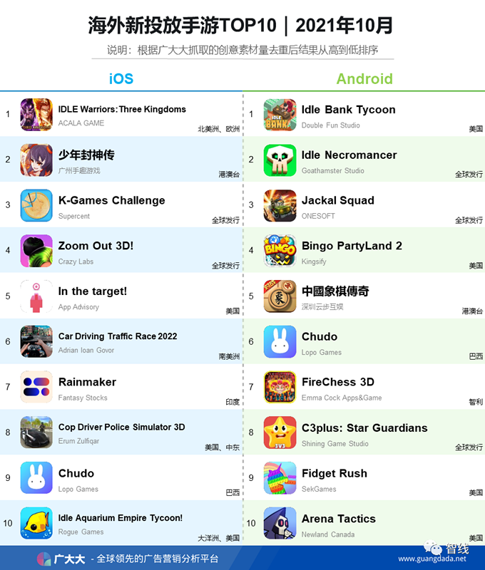 在游戏类型上,放置类产品于 10 月份迎来小爆发,本次榜单中共有 4 款游戏主打放置玩法,其中【IDLE Warriors:Three Kingdoms】的 Android 端 10 月累计素材超 1700 条,位于安卓新游投手游榜单的素材量榜首。