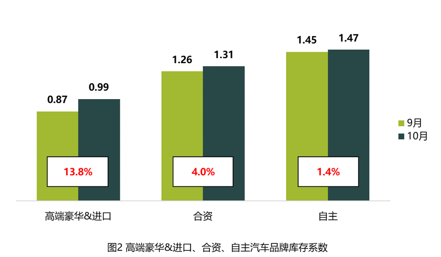 二、高端豪华&进口、合资、自主品牌库存系数环比上升