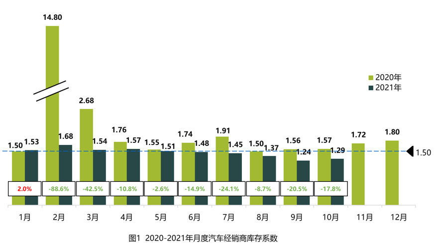 2021年11月10日,中国汽车流通协会发布2021年10月份“汽车经销商库存”调查结果:10月份汽车经销商综合库存系数为1.29,同比下降17.8%,环比上升4.0%,库存系数位于警戒线下方。
