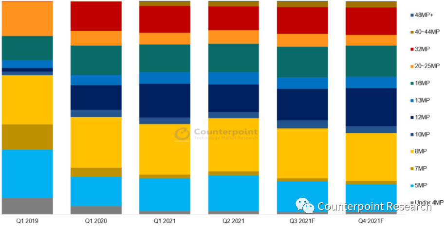 Counterpoint:尽管供应短缺,智能手机主摄像素仍持续升级 2021年第二季度,搭载48MP及以上像素后置主摄的智能手机销量占到智能手机总销量的43%,较2021年第一季度的38.7%大幅上升。 前置主摄方面,由于高端机型销量下滑,20MP及以上像素的销量份额环比几乎持平。 尽管半导体行业仍产能紧张,供给不足,但智能手机后置主摄持续升级,高阶像素价格继续下探。Counterpoint 智能手机摄像头跟踪的最新研究显示,2021年第二季度,搭载48MP及以上像素后置主摄的智能手机销量占到智能手机总销量的43%,较2021年第一季度的38.7%大幅上升。其中,64MP销量环比增长3.5%,占总销量的14%。 高级分析师 Ethan Qi 就这一趋势评论道:“48MP和64MP广泛应用在200-400美元价格段机型,旗舰手机则追求单反相机般的拍照性能,多采用大底、大像素传感器,其中50MP最受欢迎。尽管2021年第二季度108MP的销量份额略降至3.1%,但三星的0.7微米108MP传感器推动价格下探,红米和realme等厂商的中端机型纷纷采用这一传感器。” 另一方面,受到供给不足的影响,低阶像素传感器价格大幅上扬。自今年年初以来,5MP的价格涨幅就超过了10%。尽管如此,入门级智能手机(批发价低于 100 美元)的后置主摄像素仍在升级,从8MP及以下像素向12MP或13MP升级。因此,2021年第二季度,8MP及以下传感器的销量份额降至5.9%。我们预计,在三星8月份发布Z系列以及苹果9月份推出iPhone 13系列之后,12MP在今年下半年的份额将大幅提升。 智能手机后置主摄各像素销量份额(%) 来源: Counterpoint Smartphone Camera Tracker, Q2 2021 前置主摄方面,由于高端机型销量下滑,20MP及以上像素的销量份额环比几乎持平。但是,我们预计未来会有更多高端机型采用32MP甚至48MP前置主摄,因此20MP及以上像素的销量份额将继续走高。 同时,由于市场对低端智能手机的需求强劲,2021年第二季度8MP及以下像素的销量份额增至45.2%,其中5MP和8MP合计占到总销量的41.7%。 智能手机前置主摄各像素销量份额(%) 来源: Counterpoint Smartphone Camera Tracker, Q2 2021 2021年9月,三星推出了全新的ISOCELL HP1传感器,进一步将智能手机行业推向200MP时代。我们预计,未来几个季度会看到旗舰机型搭载该传感器。10月,索尼推出了1英寸12MP后置主摄XperiaPro-I,力求为消费者带来单反相机般的拍照体验。尽管中、高端智能手机(批发价200美元以上)将继续采用大底、大像素传感器,但供应短缺和价格上涨可能会减缓这一趋势,我们对此将保持密切跟踪。 更多阅读:Counterpoint:2023年10月全球畅销手机榜 八国TOP5中iPhone占据首位Counterpoint:2023年Q1印度智能手机市场出货量3100多万部 同比下降19%Counterpoint:预计2022年采用M系列苹果自研芯片iPad销量或达20%Counterpoint:2019下半年中国智能手机市场总结及2020年展望Counterpoint:2021年第三季度全球智能手机 AP(应用处理器)/SoC(片上系统)出货量同比增长 6%Counterpoint:2022年Q1智能手机 AP/SoC 和基带出货量同比下降 5%Counterpoint:2022年1月全球5G智能手机销售渗透率首次超过4GCounterpoint :2021年第一季度iPhone 12系列占智能手机行业总收入的1/3Counterpoint :2020年第四季度印尼智能手机线上销量创历史新高达20%Counterpoint:2020年第二季度中国的5G手机销量占1/3Counterpoint:2021年第三季度印度智能手机出货量突破5200万部Counterpoint:2021年二季度中国智能手机销量7500万部 环比下降13%Counterpoint :2020全球手机销量约四分之一来自线上渠道Counterpoint:2020年印度智能手机市场出货量1.5亿部Counterpoint:iPhone 12的成本比iPhone 11增加21%