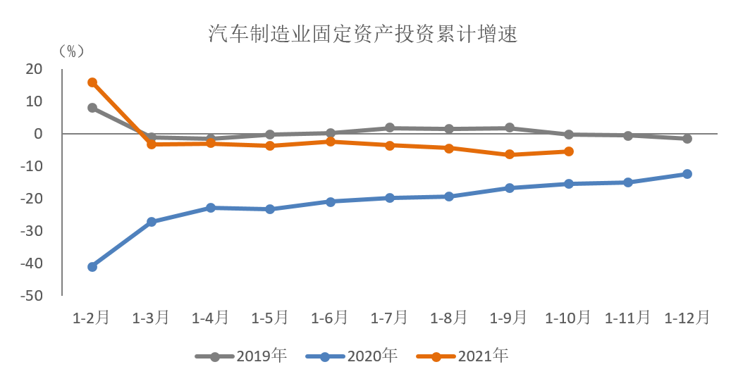 中国汽车工业协会:2021年1-10月汽车制造业固定资产投资同比降幅略有收窄 据中国汽车工业协会整理的国家统计局公布数据显示,2021 年 1-10 月,汽车制造业固定资产投资同比延续了下降趋势,降幅较前三季度有所收窄。 2021 年 1-10 月,汽车制造业固定资产投资同比下降 5.5%,降幅比前三季度收窄 1 个百分点。 更多阅读:中国汽车工业协会:2021年1-8月汽车制造业完成营业收入达到55227.8亿元 同比增长15.4%中国汽车工业协会:2022年汽车制造业利润略有增长中国汽车工业协会:2023年1-7月汽车制造业利润同比微增中国汽车工业协会:2022年1-11月汽车制造业利润同比小幅增长中国汽车工业协会:2022年1-11月汽车制造业固定资产投资继续保持快速增长中国汽车工业协会:2022年1-11月汽车制造业利润同比小幅增长中国汽车工业协会:2022年1-9月汽车制造业完成营业收入66085.1亿元中国汽车工业协会:2022年1-10月汽车制造业营业收入继续保持较快增长中国汽车工业协会:2022年1-8月汽车制造业固定资产投资稳中有升中国汽车工业协会:2022年1-9月汽车制造业利润降幅继续大幅收窄中国汽车工业协会:2022年6月汽车制造业工业增加值同比呈明显增长中国汽车工业协会:2022年1-5月汽车制造业实现利润同比降幅比上月略有扩大中国汽车工业协会:2022年1-4月汽车制造业固定资产投资同比增速略有减缓中国汽车工业协会:2021年1-2月汽车制造业固定资产投资同比结束下降中国汽车工业协会:2022年汽车制造业固定资产投资保持快速增长