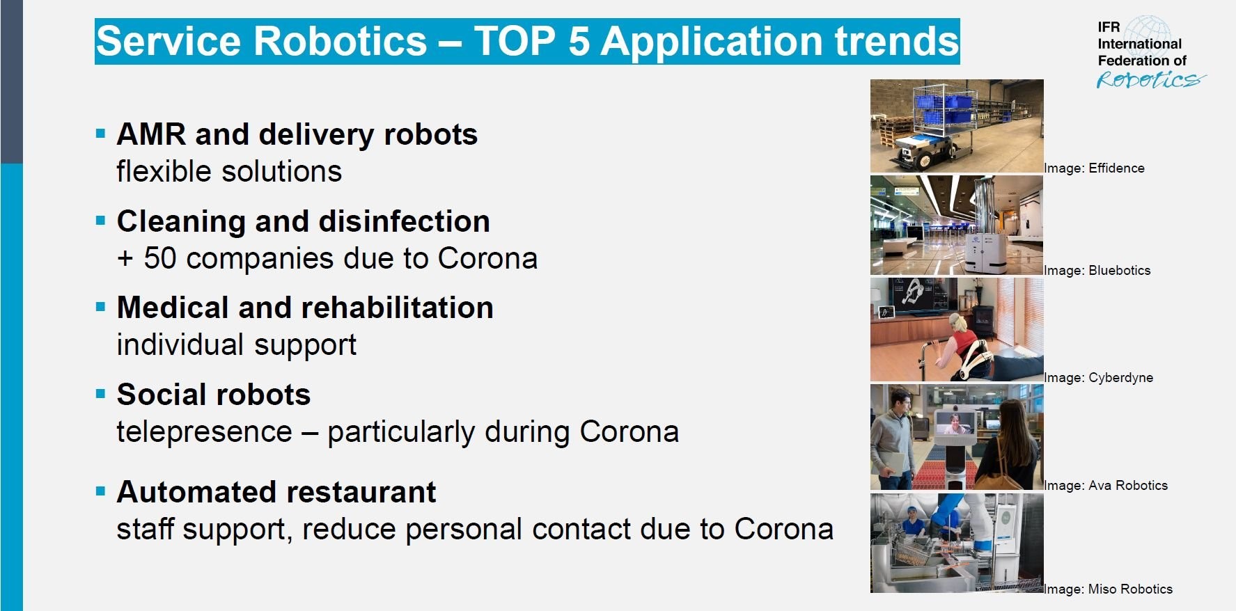 对专业清洁机器人的需求增长了92%,达到34400台。为了应对新冠大流行引起的卫生要求,50多个服务机器人供应商开发了消毒机器人喷洒消毒液或使用紫外线。医院和其他公共场所消毒机器人的发展潜力很大。从2021年到2024年,专业地板清洁机器人的销售额预计将以平均每年两位数的速度增长。