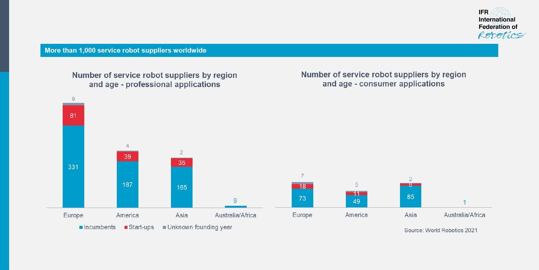 在全球范围内,1050家服务机器人供应商中有80%是五年前成立的。47%的服务机器人供应商来自欧洲,27%来自北美,25%来自亚洲。