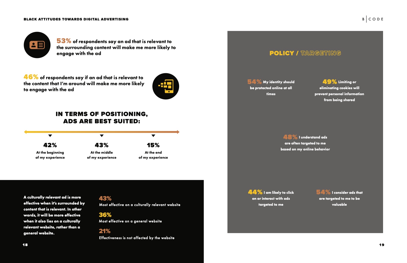 虽然54%的非洲裔美国人认为他们的身份应该在任何时候都受到保护,但同样多的人(54%)认为针对他们的广告是有价值的。