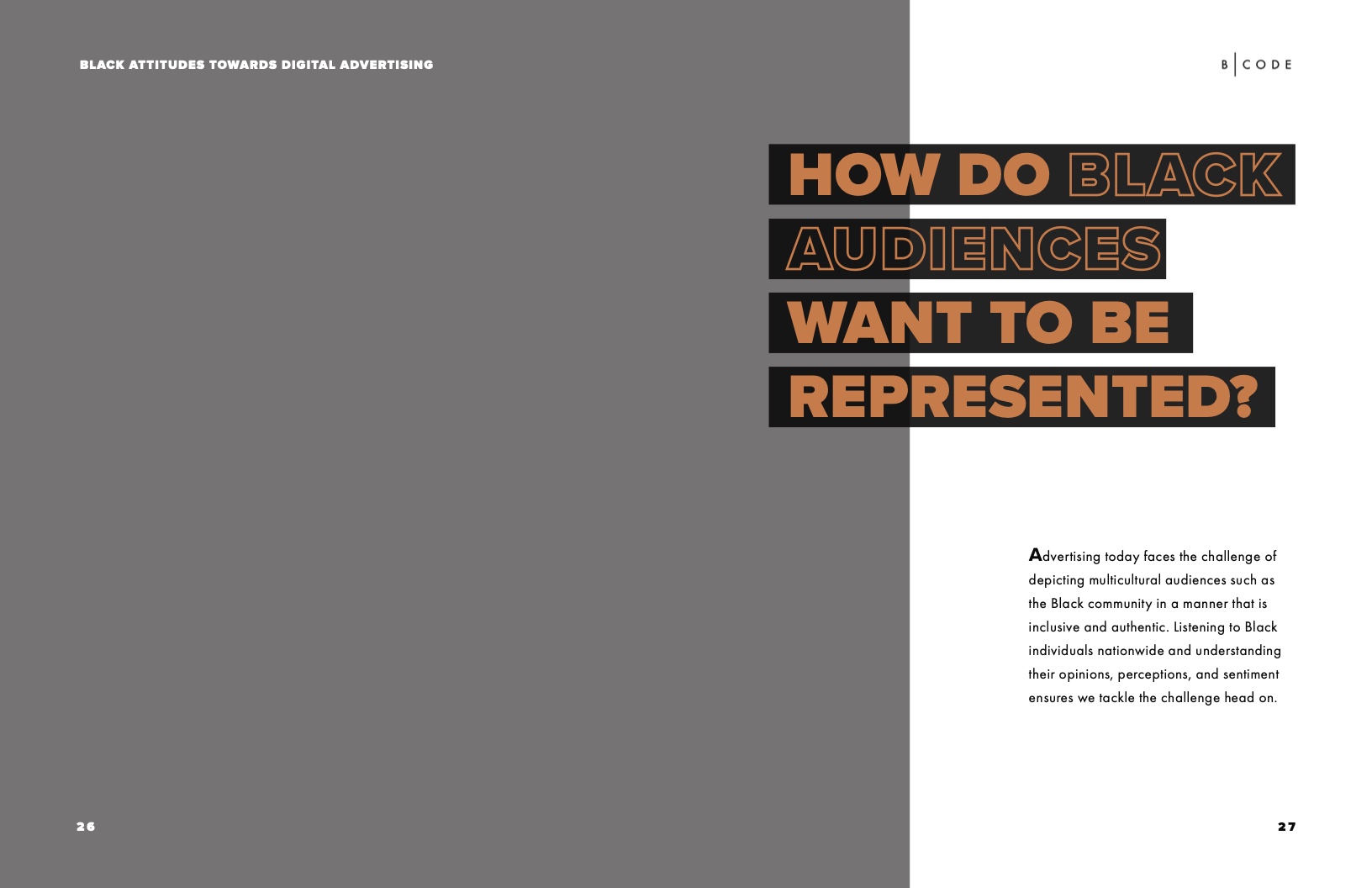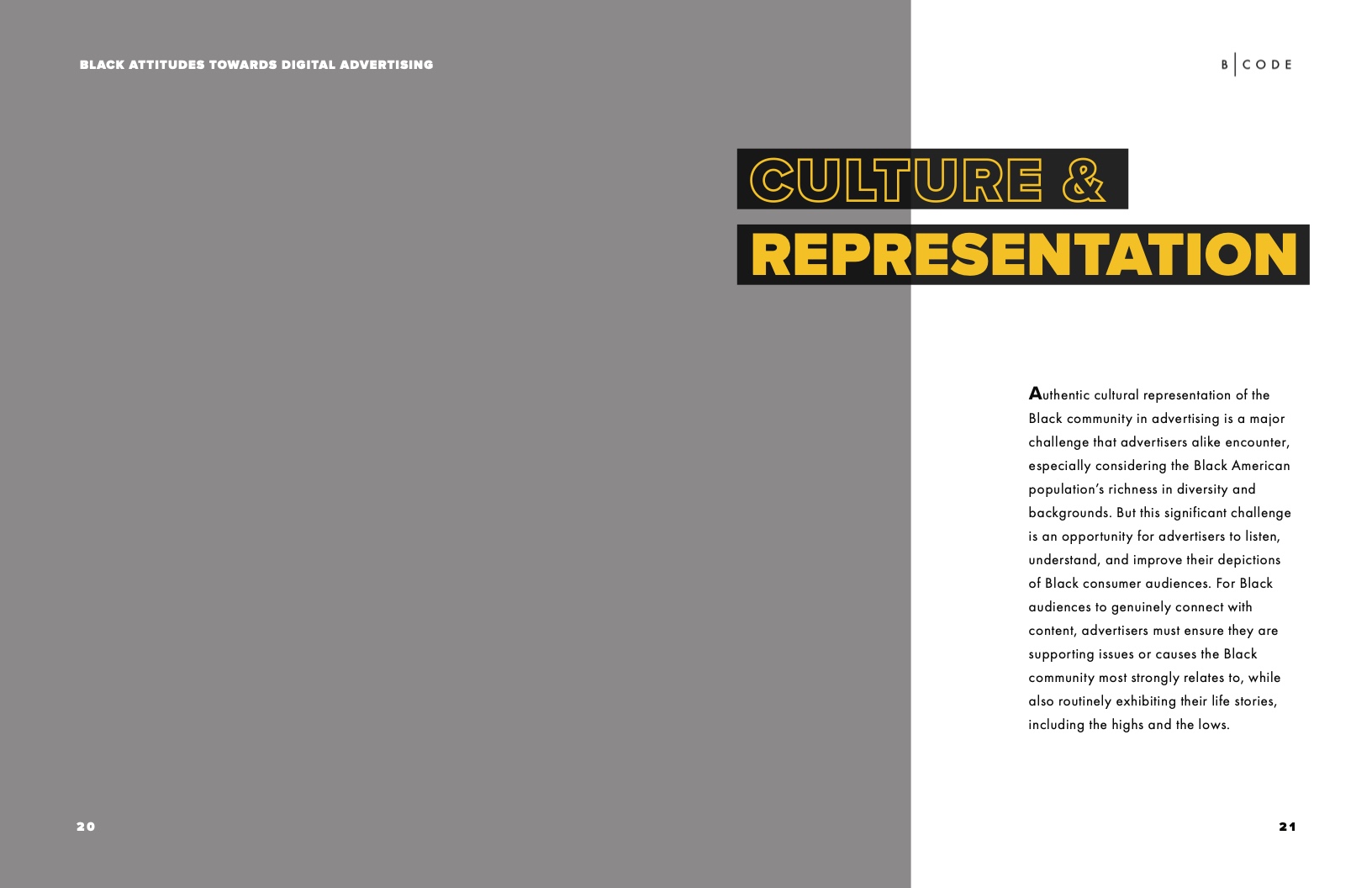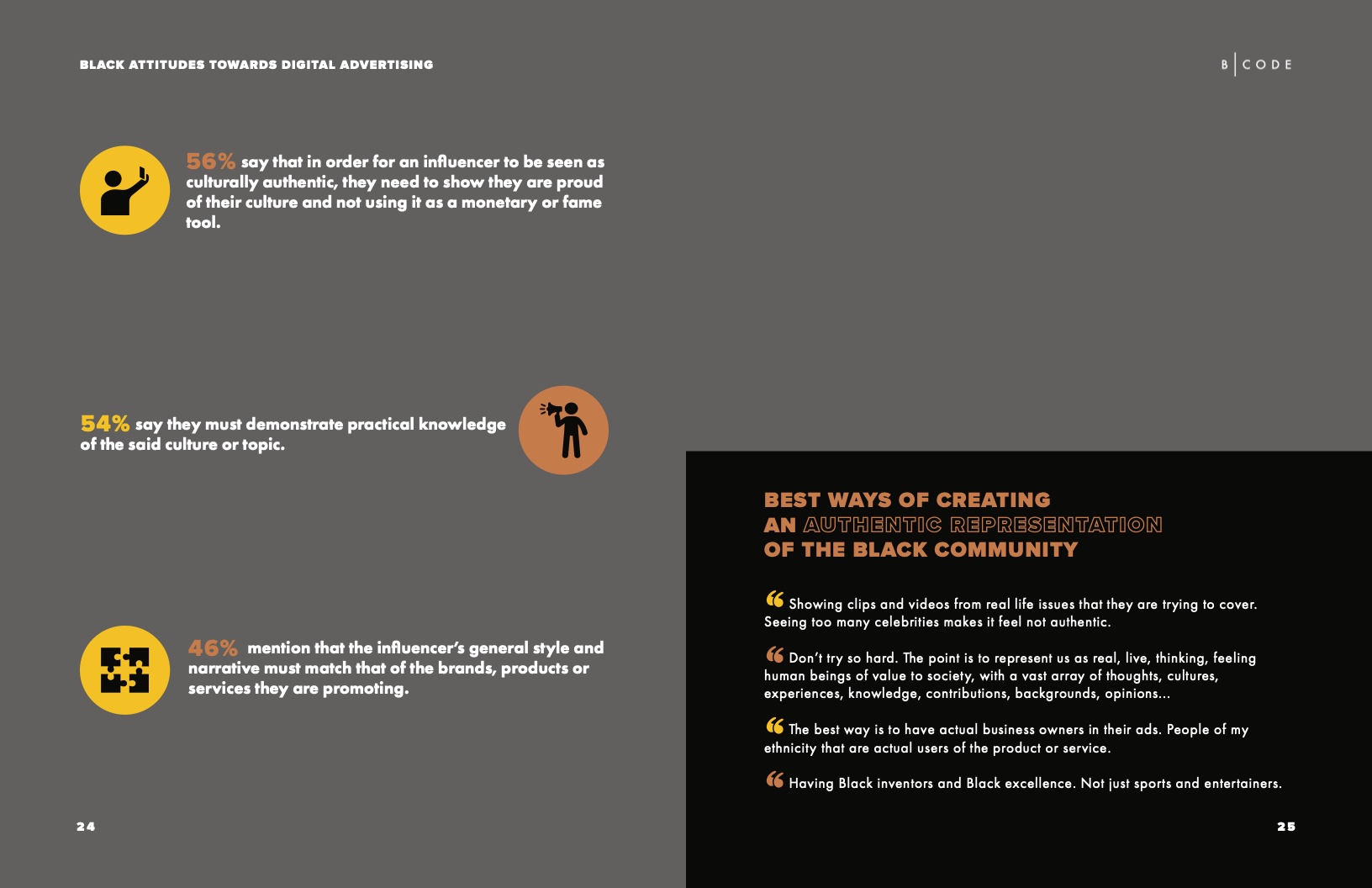 为了让非洲裔美国人在广告中感觉到更多的种族代表性,受访者列举了几种选择,其中许多与吸引他们注意力的因素相对应。这些元素中包括支持对其文化重要问题的广告(56%);以来自其民族或种族群体的真实人物的故事为特色(53%);以及与他们的文化明确相关的广告设置或背景(51%),例如节日庆典、房间装饰或派对类型。另一些人还认为,包括音乐或其他与其种族相关的艺术(50%)会让他们在广告中感觉到更多的种族代表性。