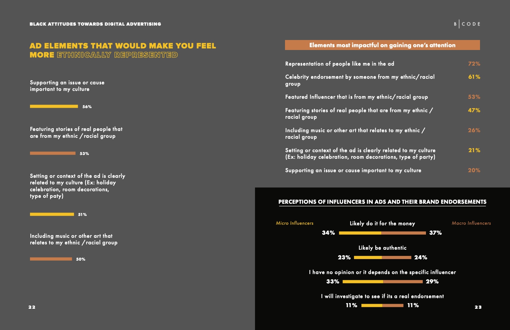 对于非洲裔美国人来说,在广告中有代表自己的人是吸引他们注意力的最重要因素之一。在550多名接受调查的非洲裔美国成年人中有72%提到了这一点。类似地,来自其民族或种族群体的名人代言(61%)和来自其民族或种族群体的意见领袖(53%)的广告也有助于吸引他们的注意力。