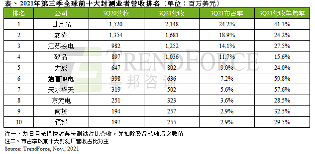 根据TrendForce集邦咨询表示,随着全球疫苗覆盖率提升,欧美各国边境逐步开放,社会的活动力开始恢复,消费性产品迎向下半年传统旺季,然供应链受到海运延迟、运费高涨及长短料影响,加上上半年部分零部件价格涨幅已高,在制造成本及物价双升的压力下,反而使得下半年终端市场出现旺季不旺的现象。不过整体需求如手机、笔电、液晶显示器等出货表现仍然优于第二季,推升封测大厂业绩增长,2021年第三季全球前十大封测业者营收达88.9亿美元,年增31.6%。