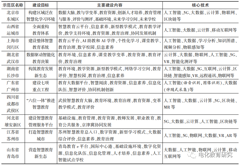 各示范区的创建发展与当地政治、经济、文化息息相关,建设目标与主要建设内容既有相通之处,又各有特色。从建设目标看,东城区侧重泛在智慧环境构建,闵行区、运城市与武侯区侧重智慧教育征途体系建设,长沙市与青岛市侧重智慧教育生态构筑,武汉市与雄安新区侧重智慧教育管理与决策平台建设,苏州市侧重打造智慧教育城市。从主要建设内容看,各示范区的主要建设内容不同程度地集中在教育环境、教育模式、教育资源、教育评价、教育治理、教育服务、信息素养七个方面[12]。此外,东城区和长沙市关注对“未来学校”发展模式的探索,运城市关注“三个课堂”建设,广州市关注智慧阅读与人工智能课程改革,雄安新区关注职业教育以及智能化科技中心和场馆教育,苏州关注打造“苏州智慧教育总入口”,青岛关注建设“青岛教育e平台”与“教育信息化国际中心港”。