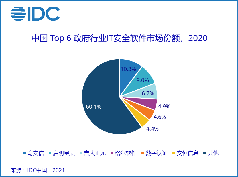 2020年,中国政府行业IT安全软件市场规模为23亿元人民币,同比增长14.4%。从市场份额来看,2020年奇安信、启明星辰和吉大正元为该市场的主要玩家。除此之外,格尔软件、数字认证、安恒信息等公司也在该市场取得了一定的市场份额。其中奇安信基于其在终端安全软件优势及安全运营中心方案,以10.3%的市场份额排在第一位;启明星辰凭借出色的漏洞扫描、漏洞管理平台和安全运营中心方案,以9.0%的市场份额排名第二;吉大正元专注发展数字证书技术,提供专业的电子证书认证系统,以6.7%的市场份额排名第三。