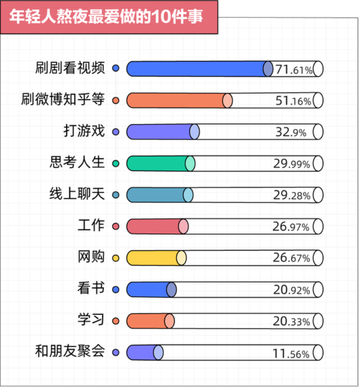 同时,调查发现,超7成年轻人熬夜最爱看剧、刷视频,过半数人熬夜喜欢刷社交媒体。那么,你在熬夜的时候,是在干嘛呢?