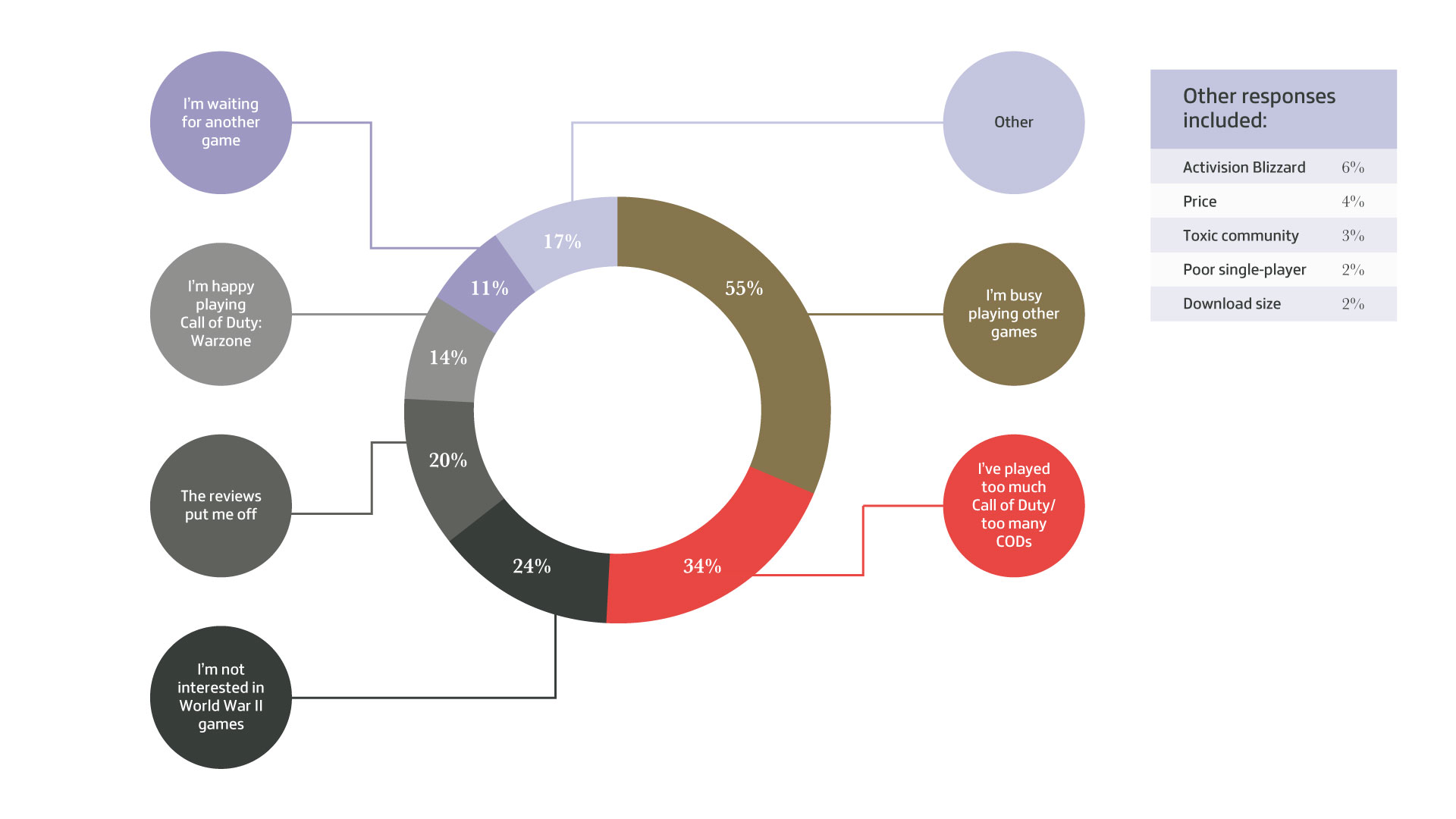 当然在其他原因中,6%的受访者表示,他们不想支持动视暴雪,因为他们的“商业行为”和“员工待遇”。还有4%的受访者表示游戏的价格也是他们不购买的《使命召唤18:先锋》一个因素,他们认为COD18的单人战役流程太短,这个定价是不合理的。还有2%的人表示游戏的单人模式做得不够好,另外2%的人说游戏的下载容量太大,另外还有3%的人说他们觉得COD18社区里到处都是骗子。
