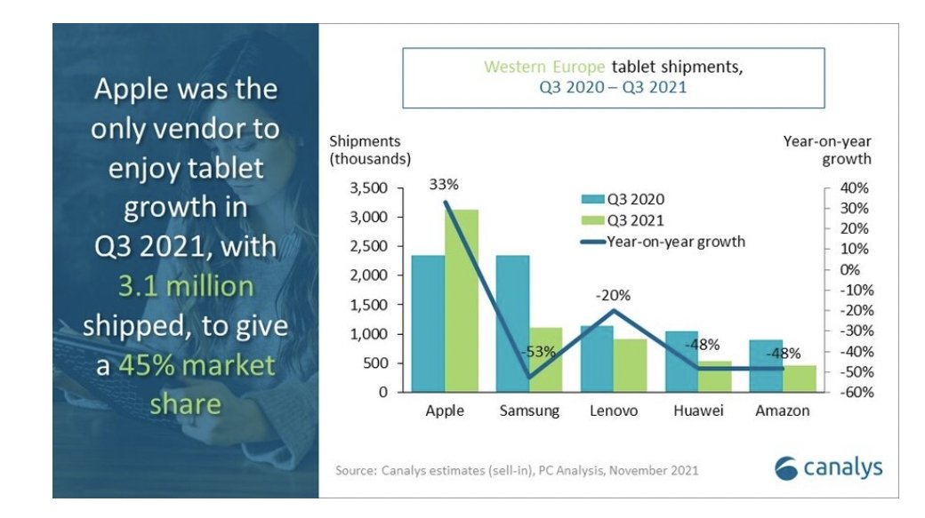 新的研究报告称,2021年第三季度,苹果公司的iPad在西欧的销量上升了33%,即使市场同比下降了20%。据报道,苹果公司持续推出新款iPad,帮助其在整个西欧看到了本季度的销量上升。根据Canalys的数据,由于该市场的出货量下降到690万台,苹果的崛起使其占据了所有平板电脑销量的45%。