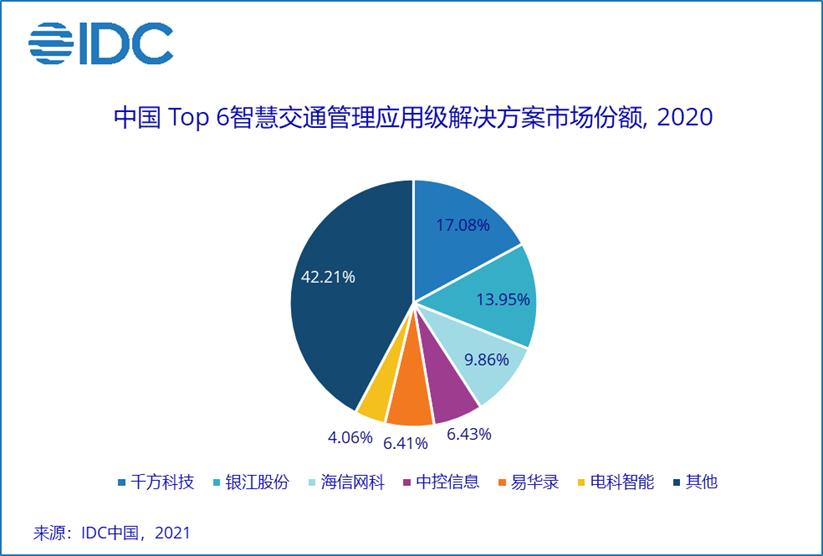 市场总量为17亿元人民币,主要玩家依旧以传统交通信息化领域的玩家为主。其中,国内行业数字化解决方案与大数据服务提供商千方科技以17%的市占率占据主导地位;聚焦与城市大脑运营的银江股份以14%市占率位居第二;海信网科围绕云计算、大数据、人工智能等技术构建的交管云脑解决方案为核心,占据近10%的市场占有率,位居第三。