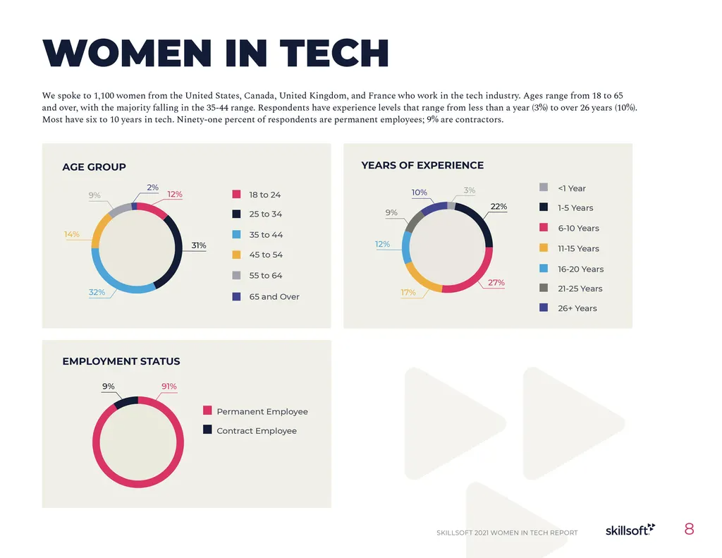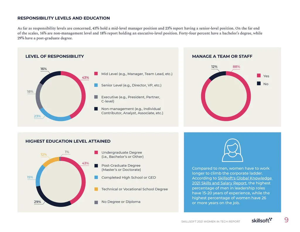 此外,Skillsoft 发现,与男性相比,科技界的女性必须工作更长时间才能爬上企业的阶梯。担任领导职务的男性中,拥有 15-20 年经验的比例最高,而女性则为 26 年或以上。