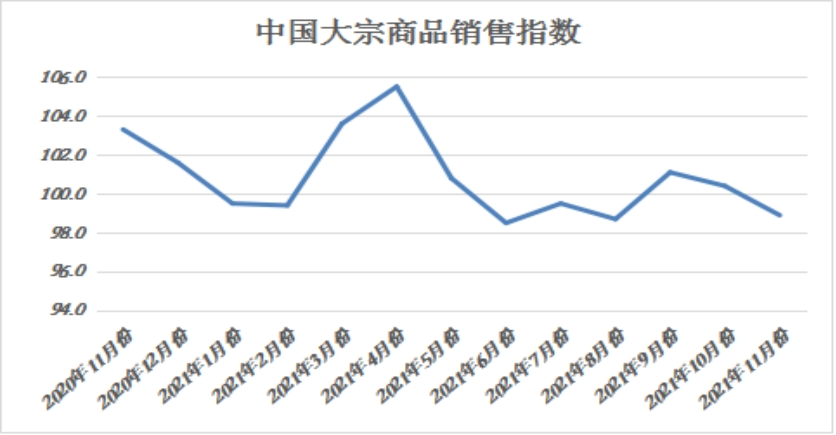 2021年11月份,大宗商品销售指数两连跌至98.9%,显示市场需求淡季来临。从指数的变化情况来看,11月份,国内大宗商品市场需求受天气影响明显下降,特别是北方地区随着天气转冷进入冬歇期,户外施工受到干扰,加之疫情反复和部分商品价格出现波动,市场恐慌情绪加重,终端企业采购越发趋于谨慎,市场订货积极性明显降低,成交明显减弱,商品生产企业订单组织压力加大。各主要商品中,除原煤和汽车销售量有所增长外,且销售增速回落,其余品种均出现不同程度的下滑态势。进入12月份,受天气影响,基建、房地产等施工将逐步停滞,大宗商品需求将继续收紧。汽车船舶等需求或相对稳定,但整体来看市场需求将低位运行。尤其是目前房地产市场投资开工均有所放缓,从国家房地产政策导向考虑来看,未来房地产核心驱动力减弱,对整个大宗商品市场的支撑也难有大幅度改观,因此在长期内房地产市场对商品需求或呈趋势性衰减态势。