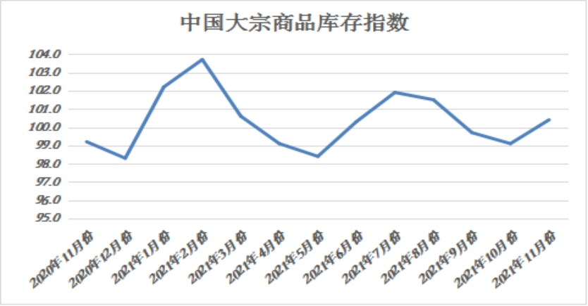 由中国物流与采购联合会调查、发布的2021年11月份中国大宗商品指数为99.2%,跌至2020年2月份以来的最低水平。各分项指数中,供应指数五连跌至二十一个月的最低,销售指数两连跌至9月份以来的最低水平,库存指数止跌反弹至近三个月的最高。从本月数据的变化情况来看,当前国内大宗商品市场供需有所失衡,商品库存开始积压,市场下行风险开始积聚。12月份,随着气温继续下降、采暖季工地停工增加,预计后期国内大宗商品市场需求将会进一步萎缩,商品价格也将进一步趋弱向下。