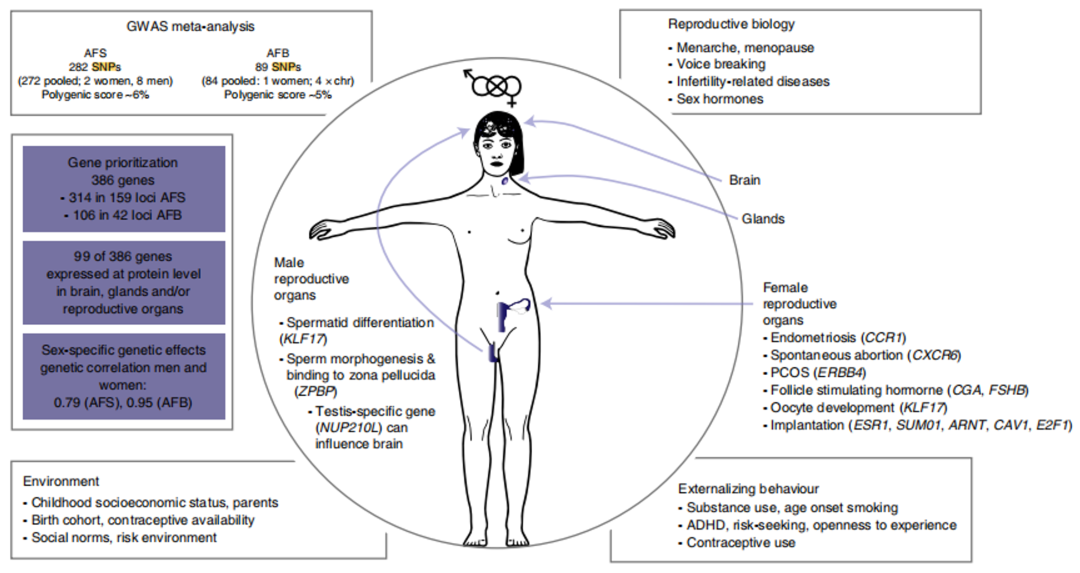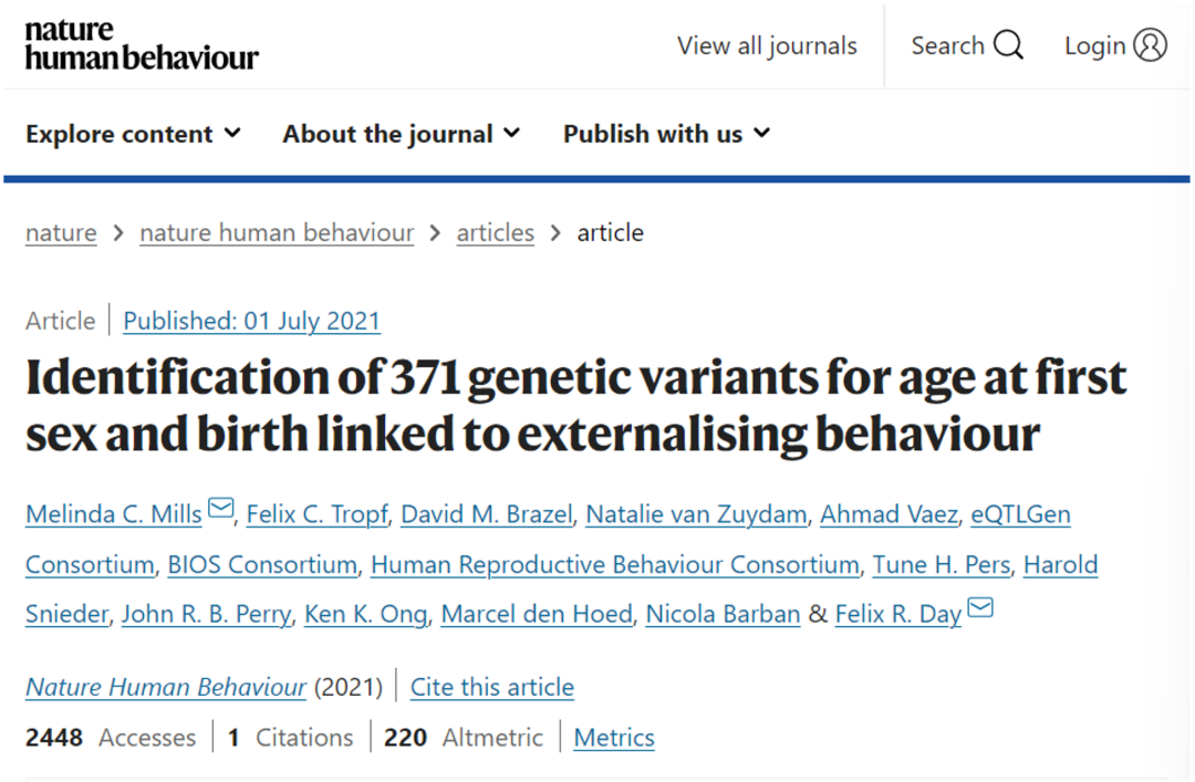 今年7月,由英国剑桥大学(University of Cambridge)、牛津大学(University of Oxford)和意大利博洛尼亚大学(University of Bologna)领衔的研究团队联合发表论文,首次将性行为年龄(age at first sexual intercourse,AFS)和首次生育年龄(age at first birth,AFB)与我们的DNA联系了起来,并试图找到其中的关系。相关研究以“Identification of 371 genetic variants for age at first sex and birth linked to externalising behaviour”为题,刊登在《自然-人类行为》(Nature Human Behaviour)期刊。