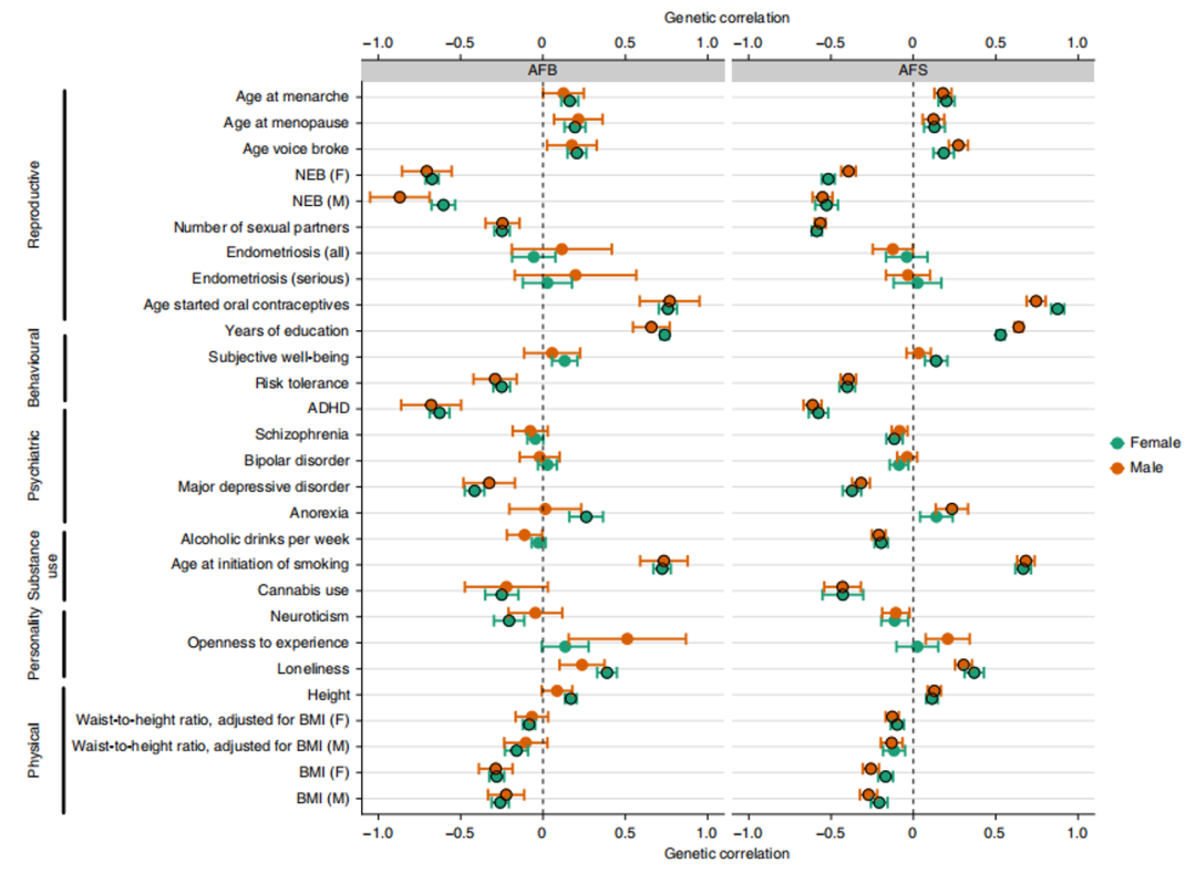 Figure 4. 首次性行为年龄与首次生育年龄和其他性状的遗传相关性 (图片来源:Nature Human Behaviour)