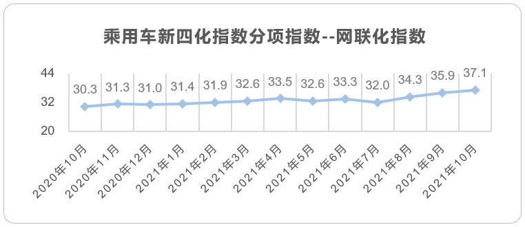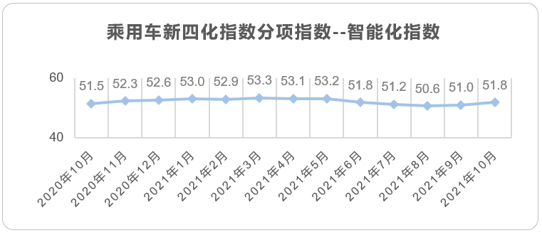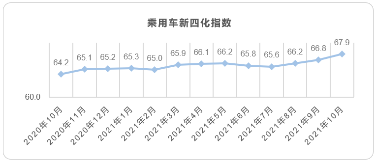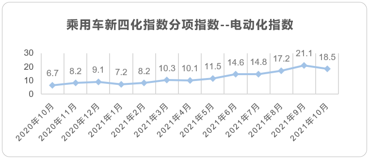 2021年10月整体市场销量达171.4万辆,同比下降14.0%,环比增长8.4%。新四化指数明显提升,除电动化指数之外其他指数均有所提升,表明全国范围内汽车芯片供给稍有回升,但与预计中的供给量比较仍有较大缺口。