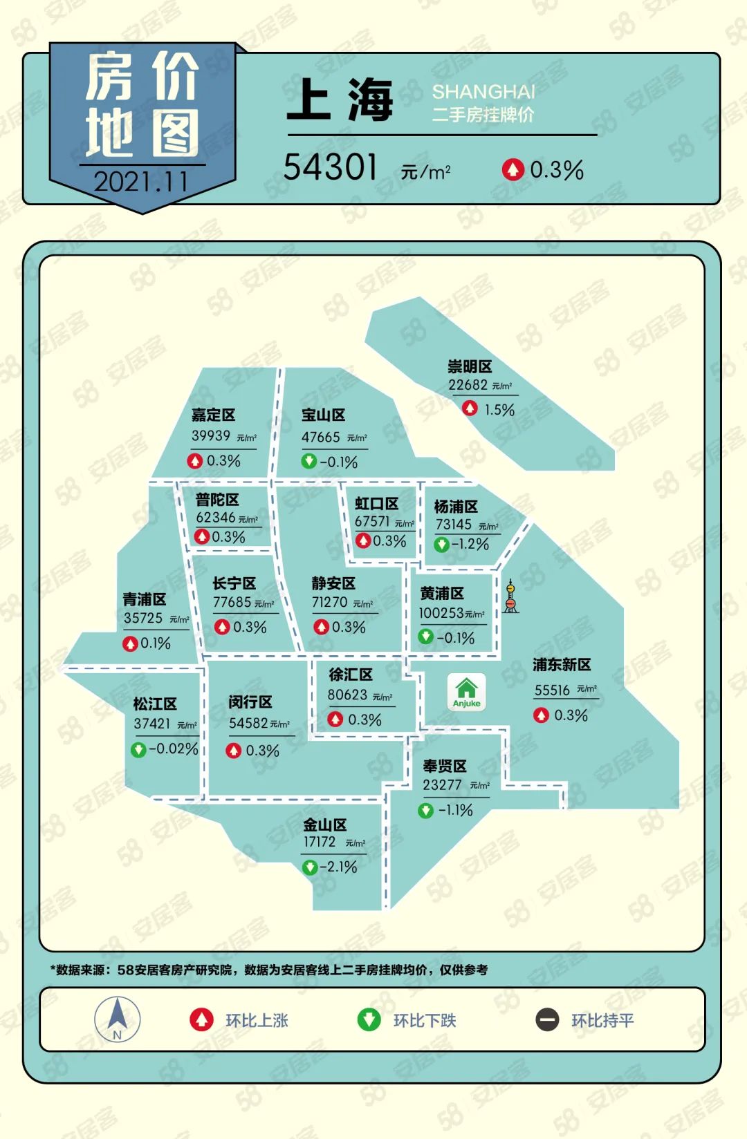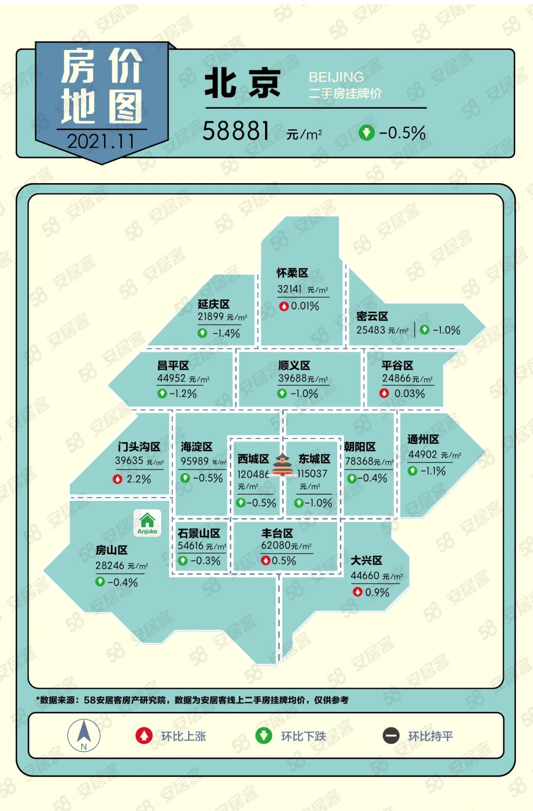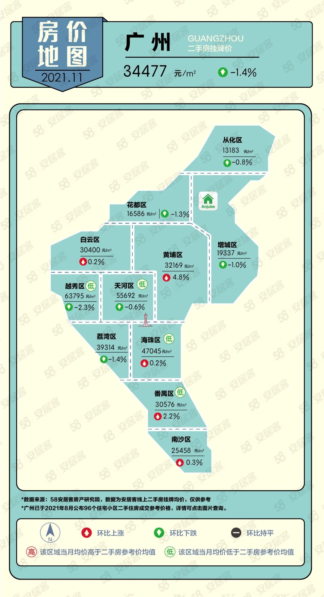 58安居客房产研究院数据显示,2021年11月全国重点监测65城二手房在线挂牌均价16840元/㎡,环比小幅下滑0.33%,全国65城中有14城二手房挂牌均价出现环比上涨趋势。具体来看,11月份一线城市中北京、广州的二手房挂牌价格环比下行,上海、深圳的二手房挂牌价格环比上涨。