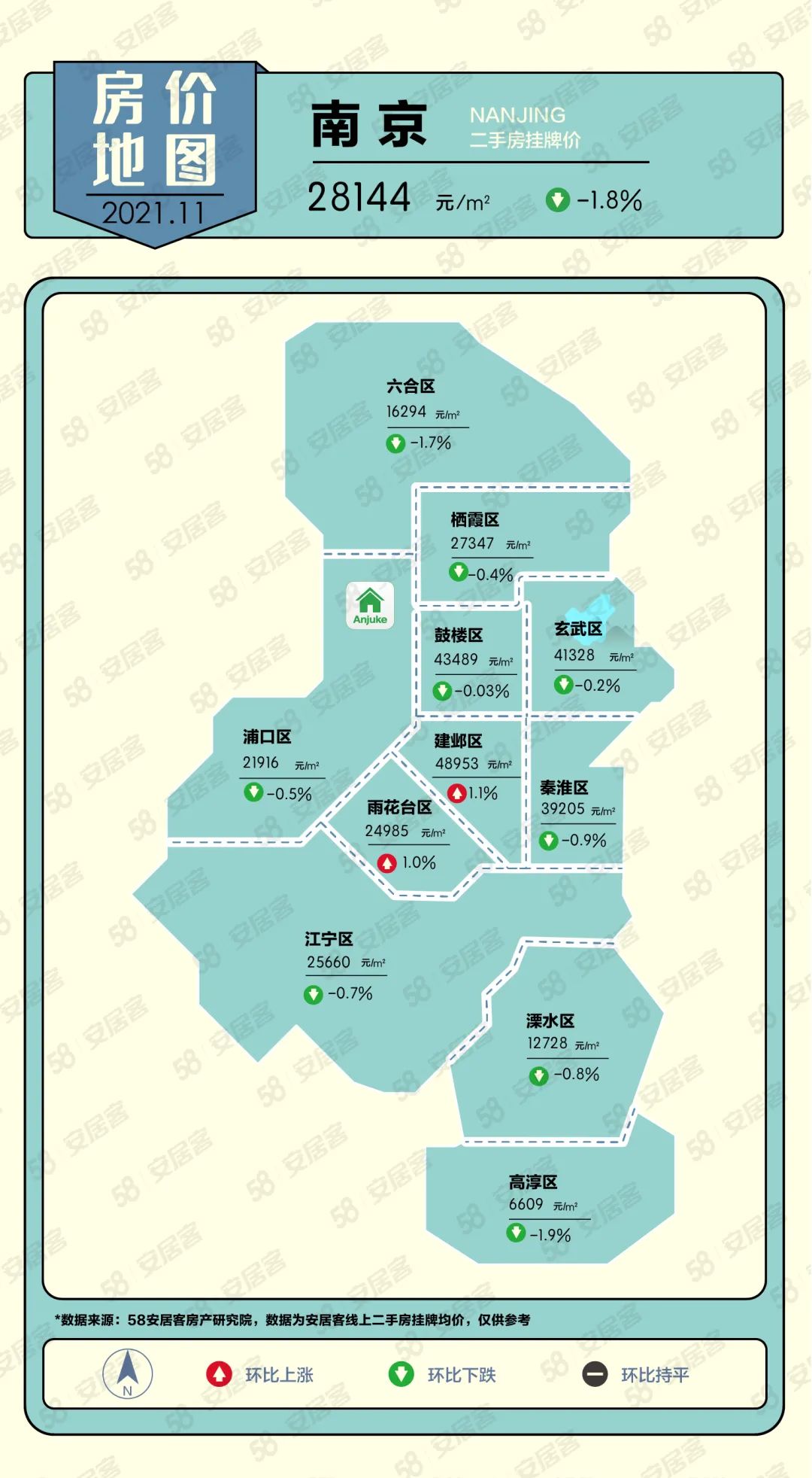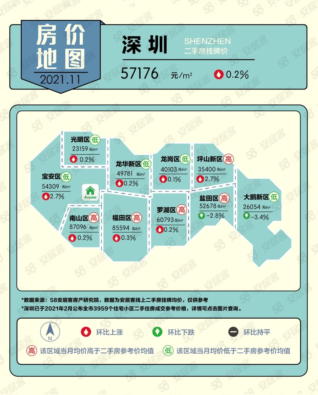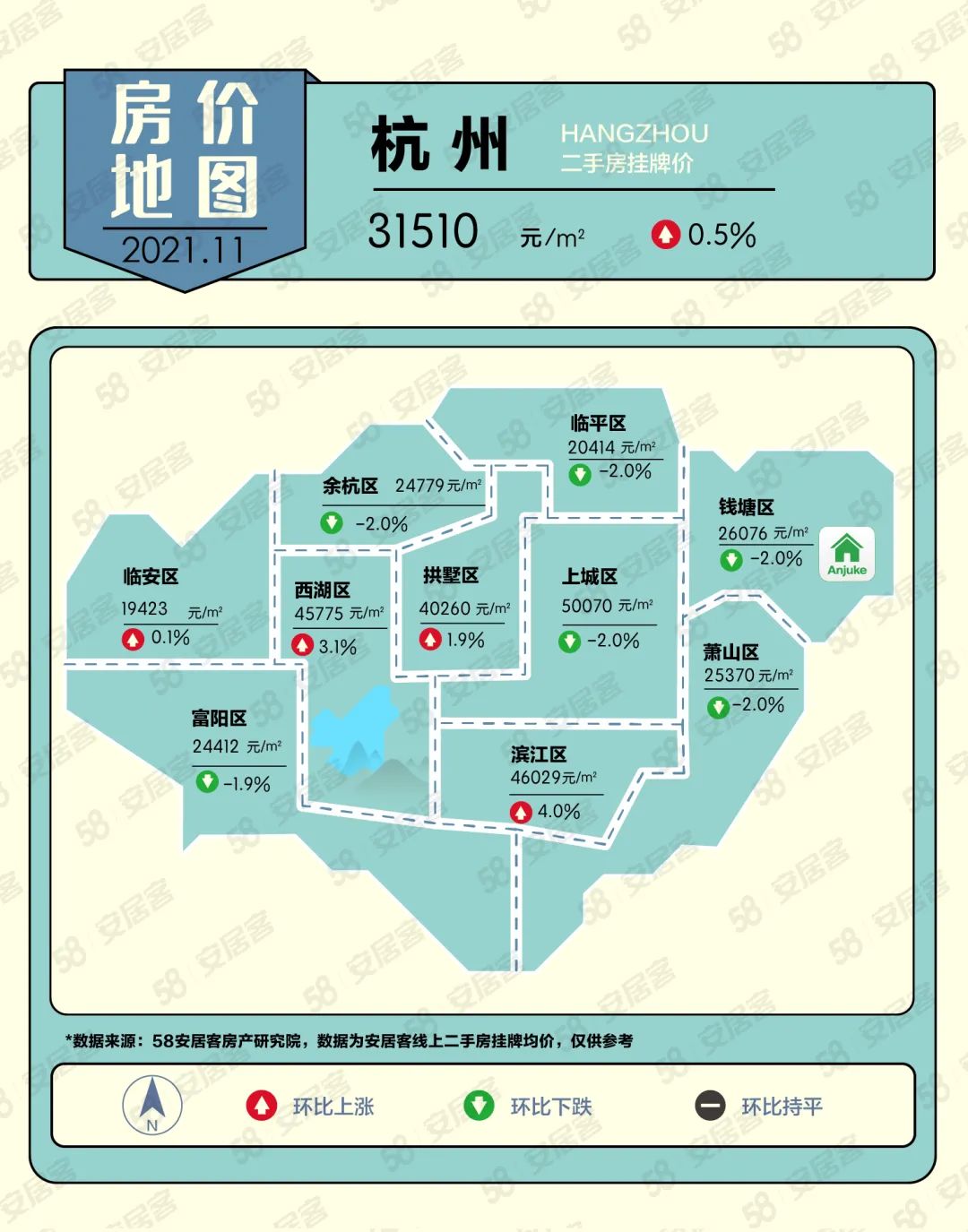 58安居客房产研究院数据显示,2021年11月全国重点监测65城二手房在线挂牌均价16840元/㎡,环比小幅下滑0.33%,全国65城中有14城二手房挂牌均价出现环比上涨趋势。具体来看,11月份一线城市中北京、广州的二手房挂牌价格环比下行,上海、深圳的二手房挂牌价格环比上涨。