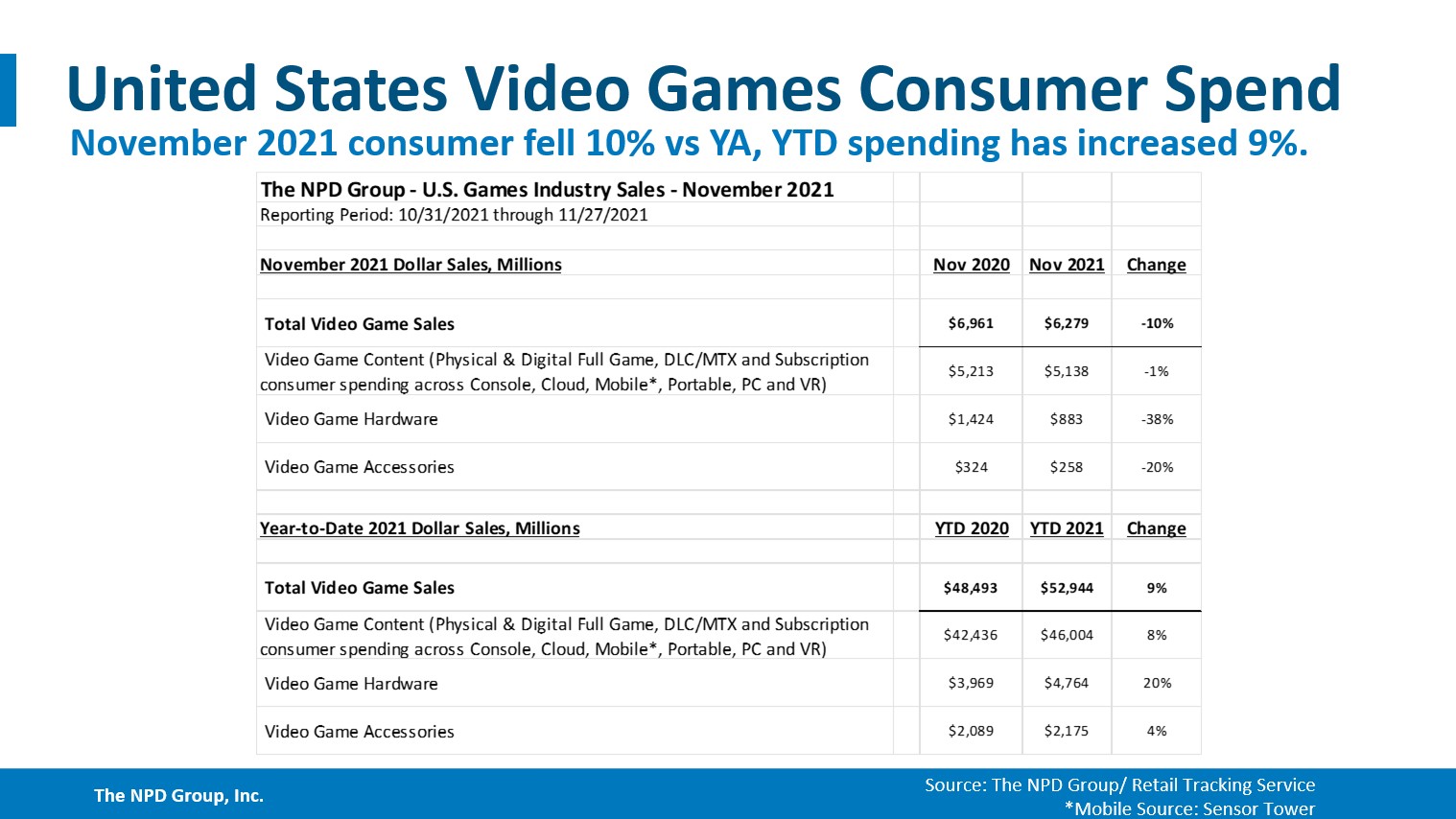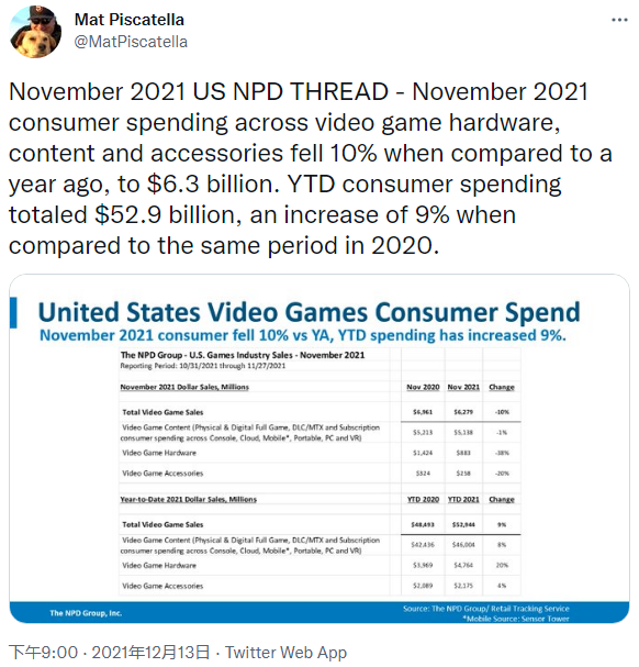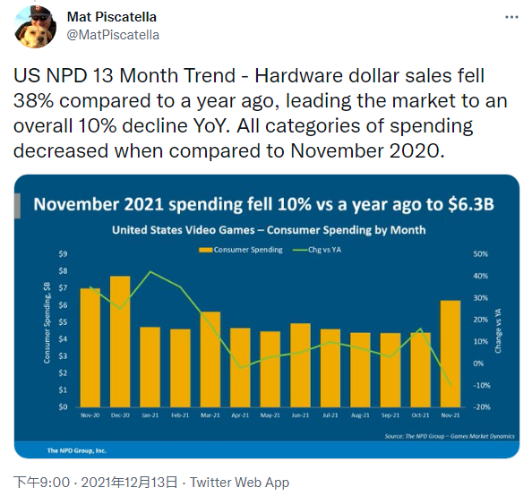 NPD Group 的零售追踪数据显示,与 2020 年同月(即 PS5 和 XSS \ XSX 发布时)相比,2021 年 11 月的游戏主机硬件销售额下降了 38%、至 8.83 亿美元。