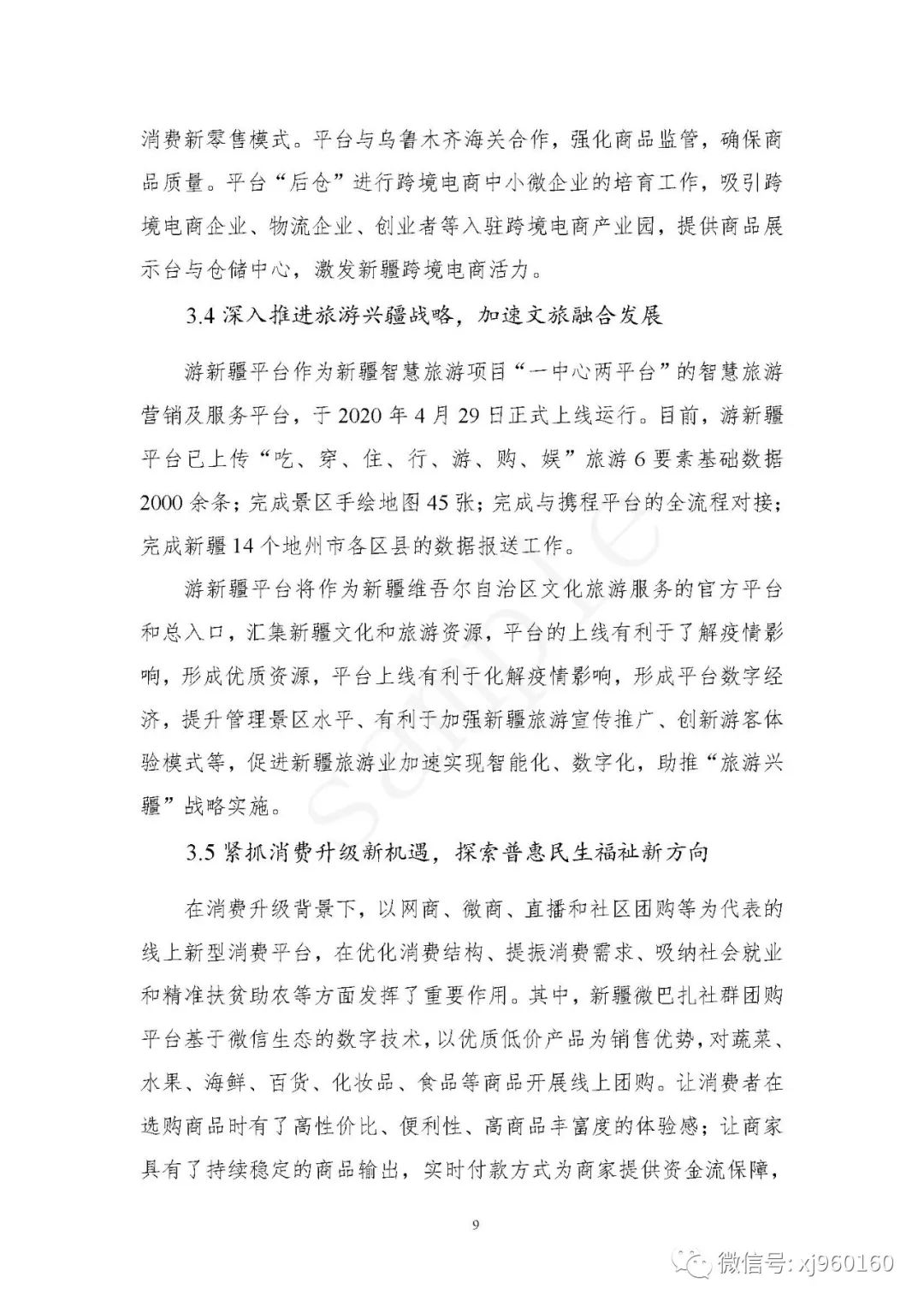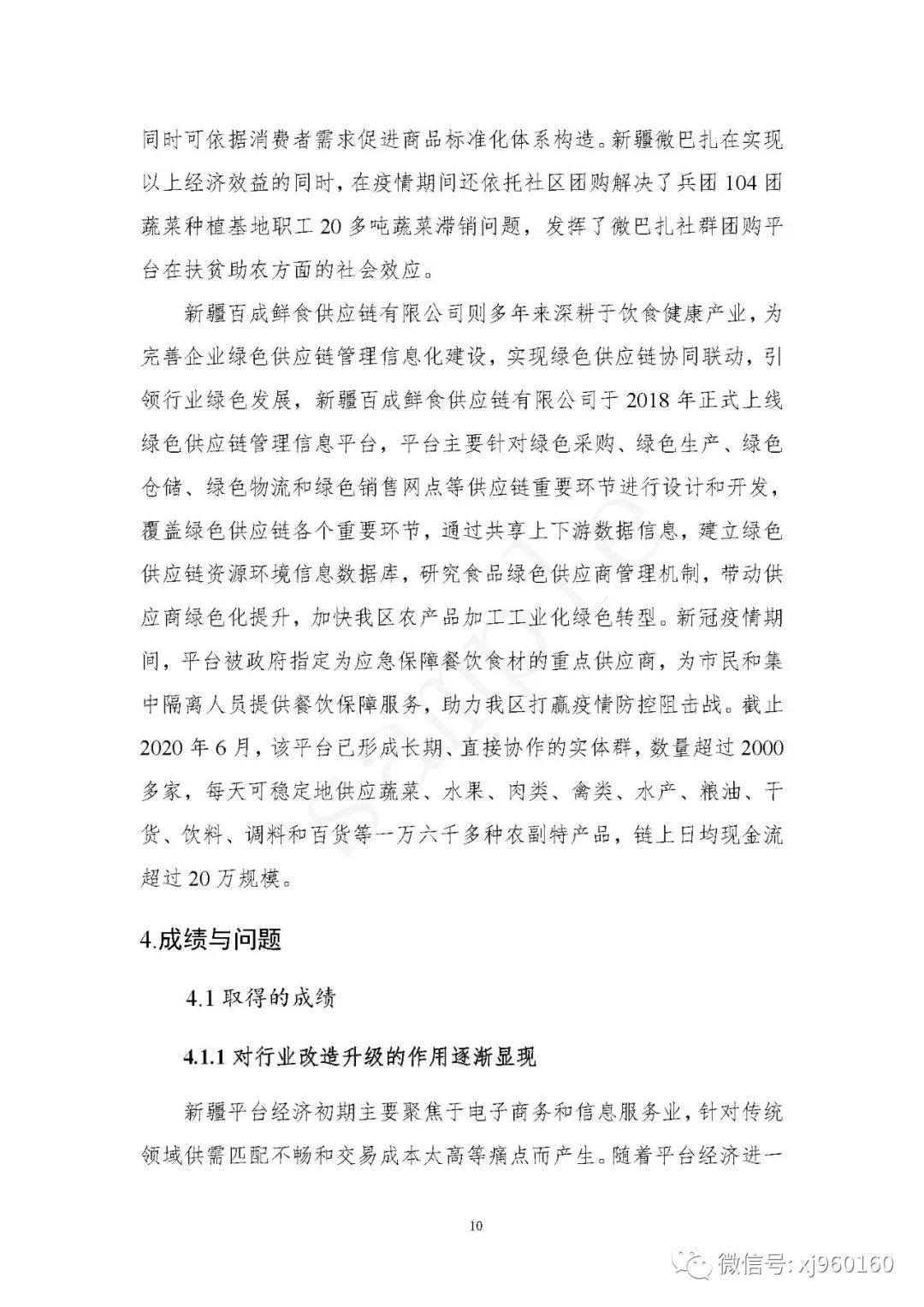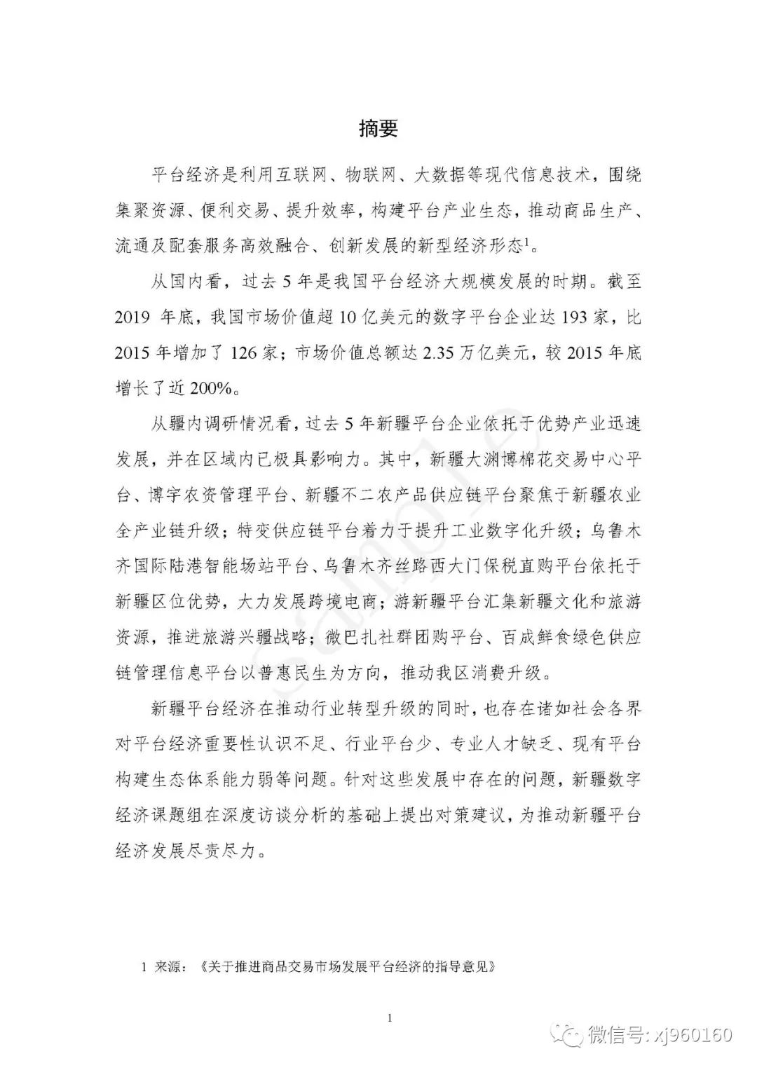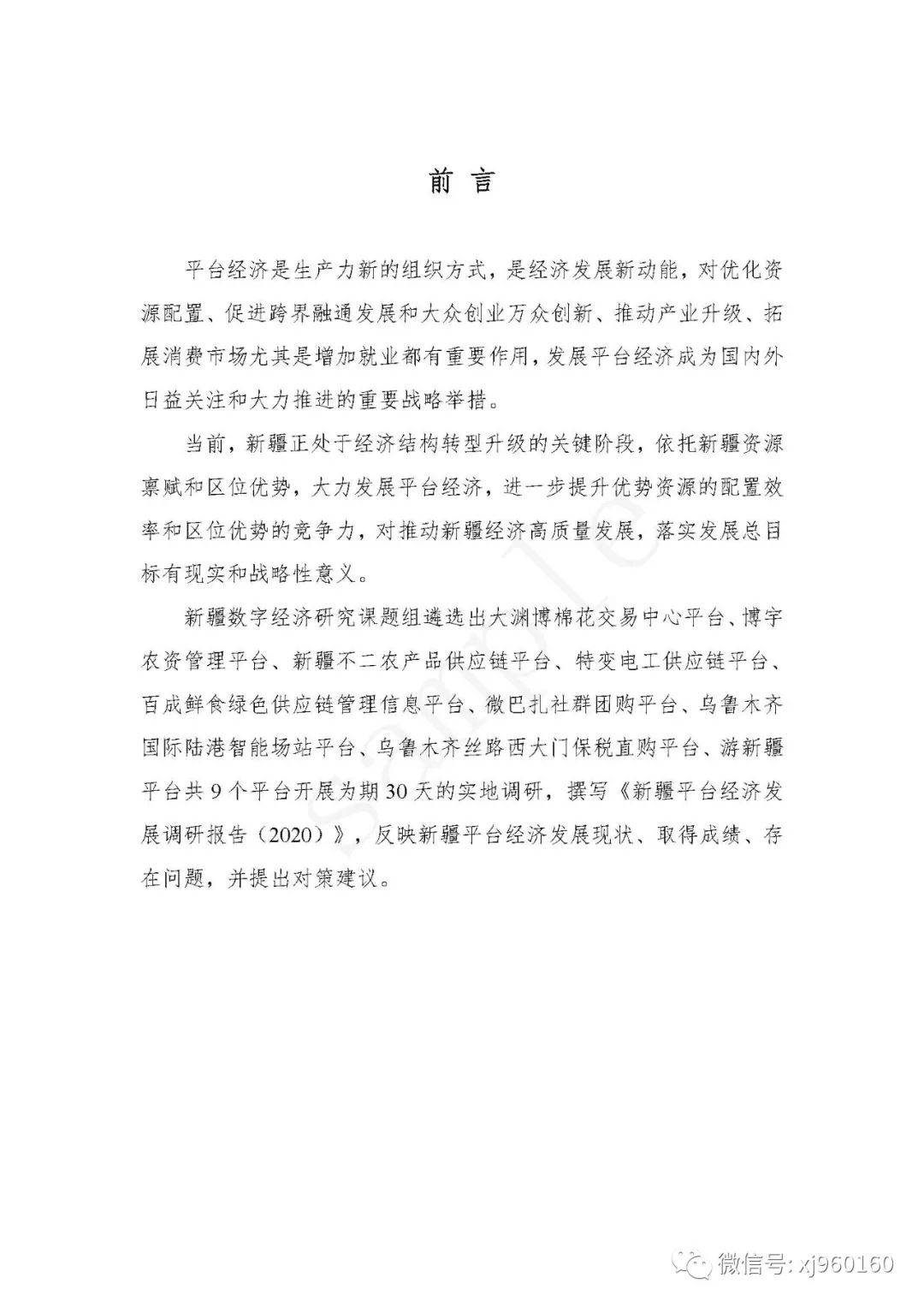 新疆数字经济研究课题组遴选出大渊博棉花交易中心平台、博宇农资管理平台、新疆不二农产品供应链平台、特变电工供应链平台、百成鲜食绿色供应链管理信息平台、微巴扎社群团购平台、乌鲁木齐国际陆港智能场站平台、乌鲁木齐丝路西大门保税直购平台、游新疆平台共9个平台开展为期 30 天的实地调研,撰写《新疆平台经济发展调研报告(2020)》,反映新疆平台经济发展现状、取得 成绩、存在问题,并提出对策建议。