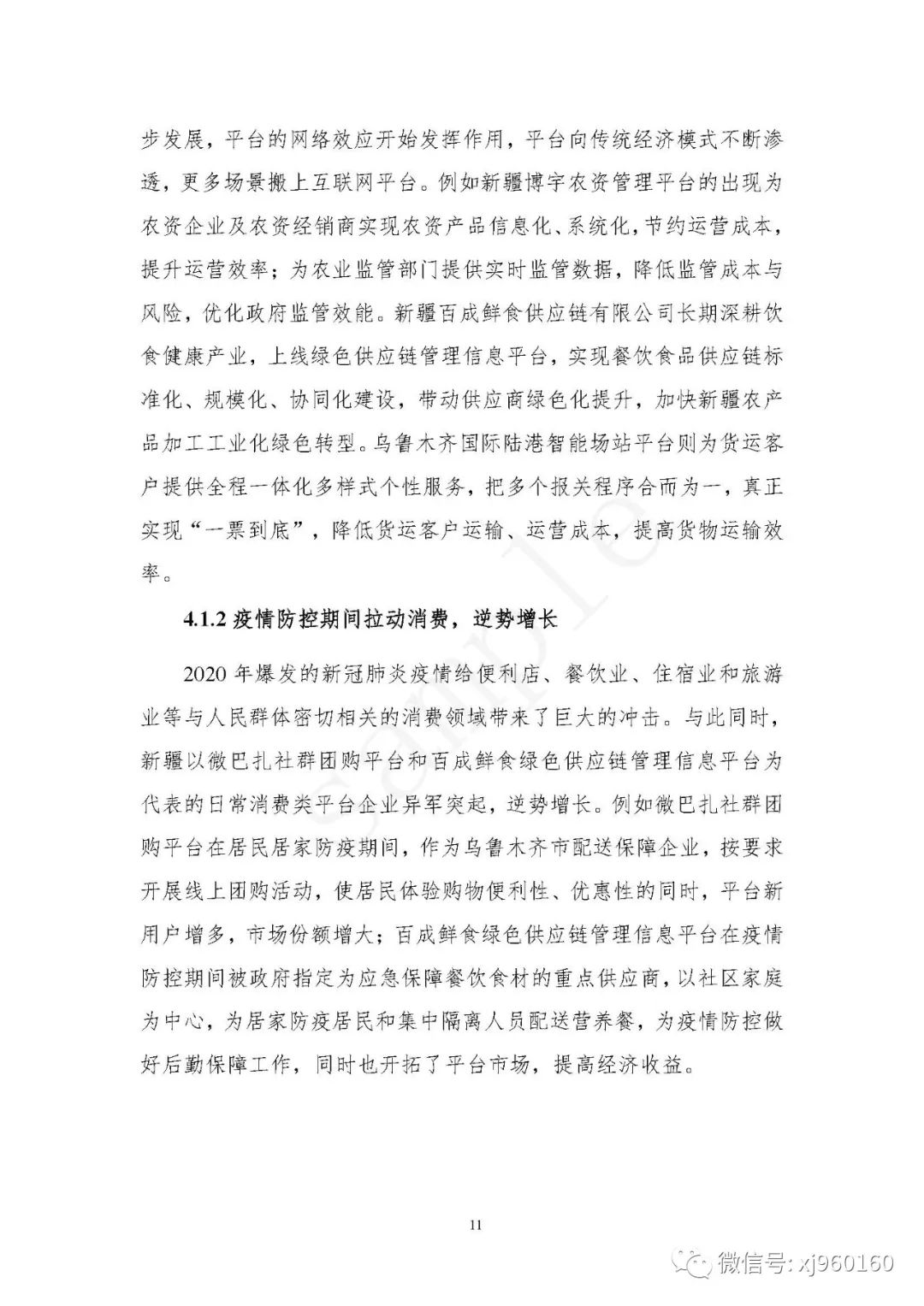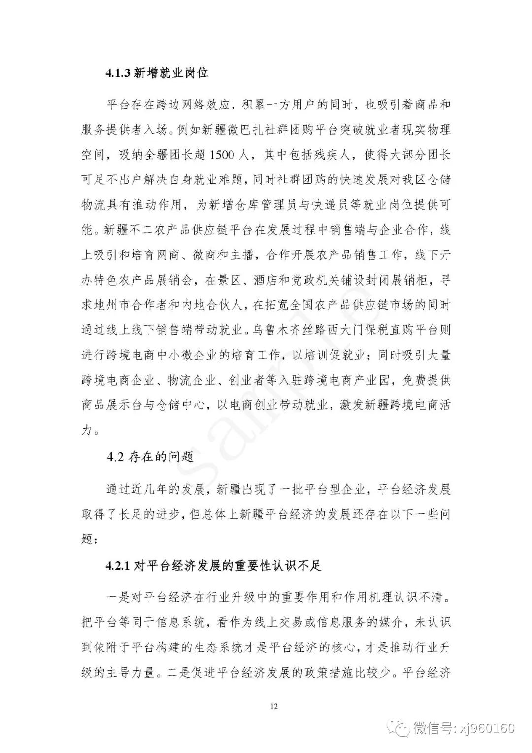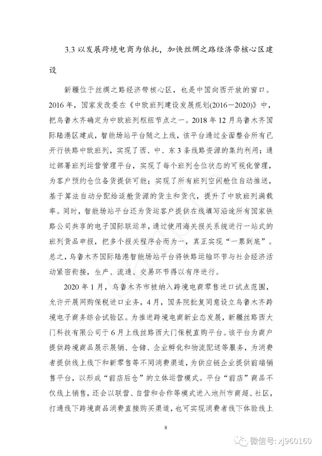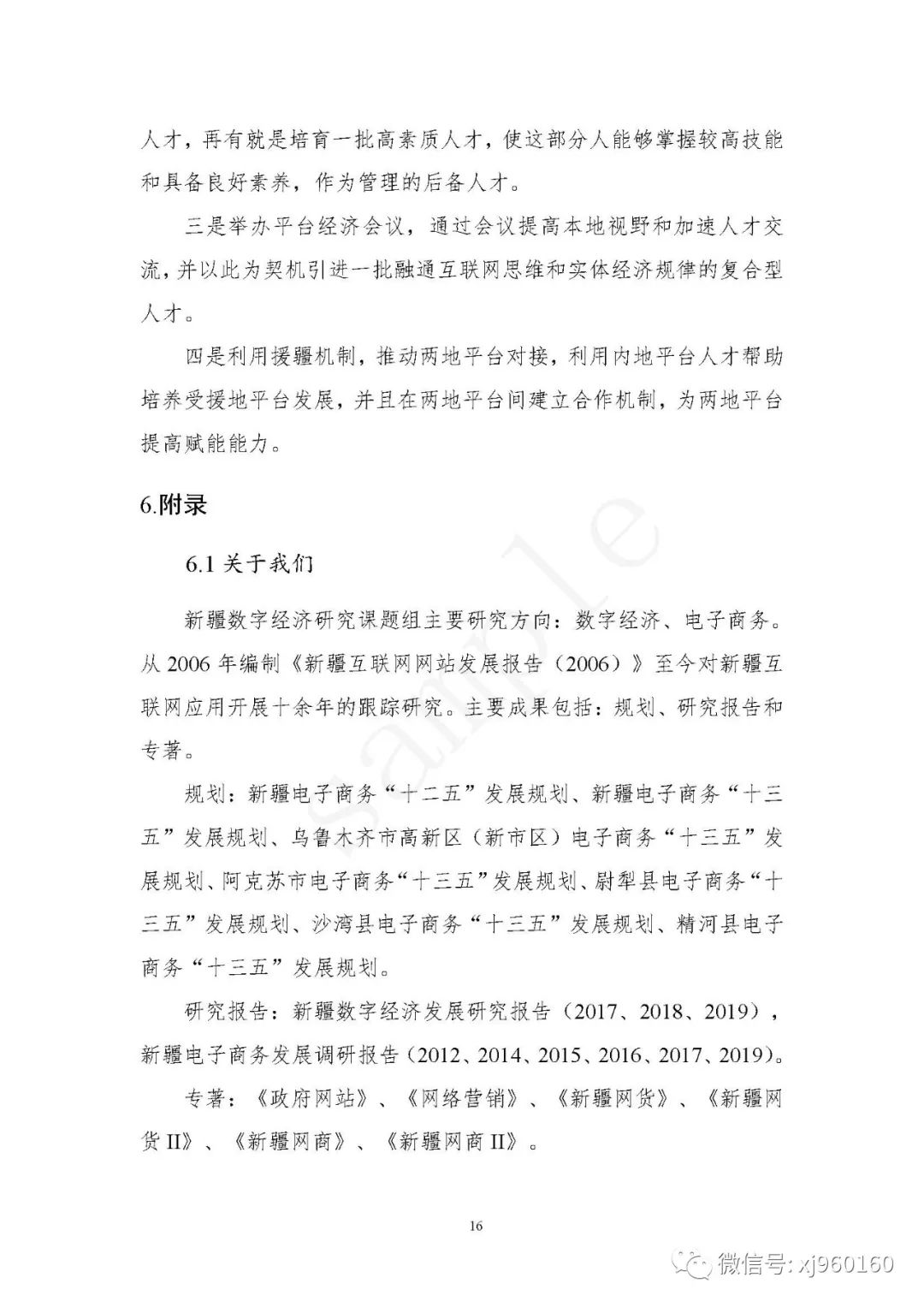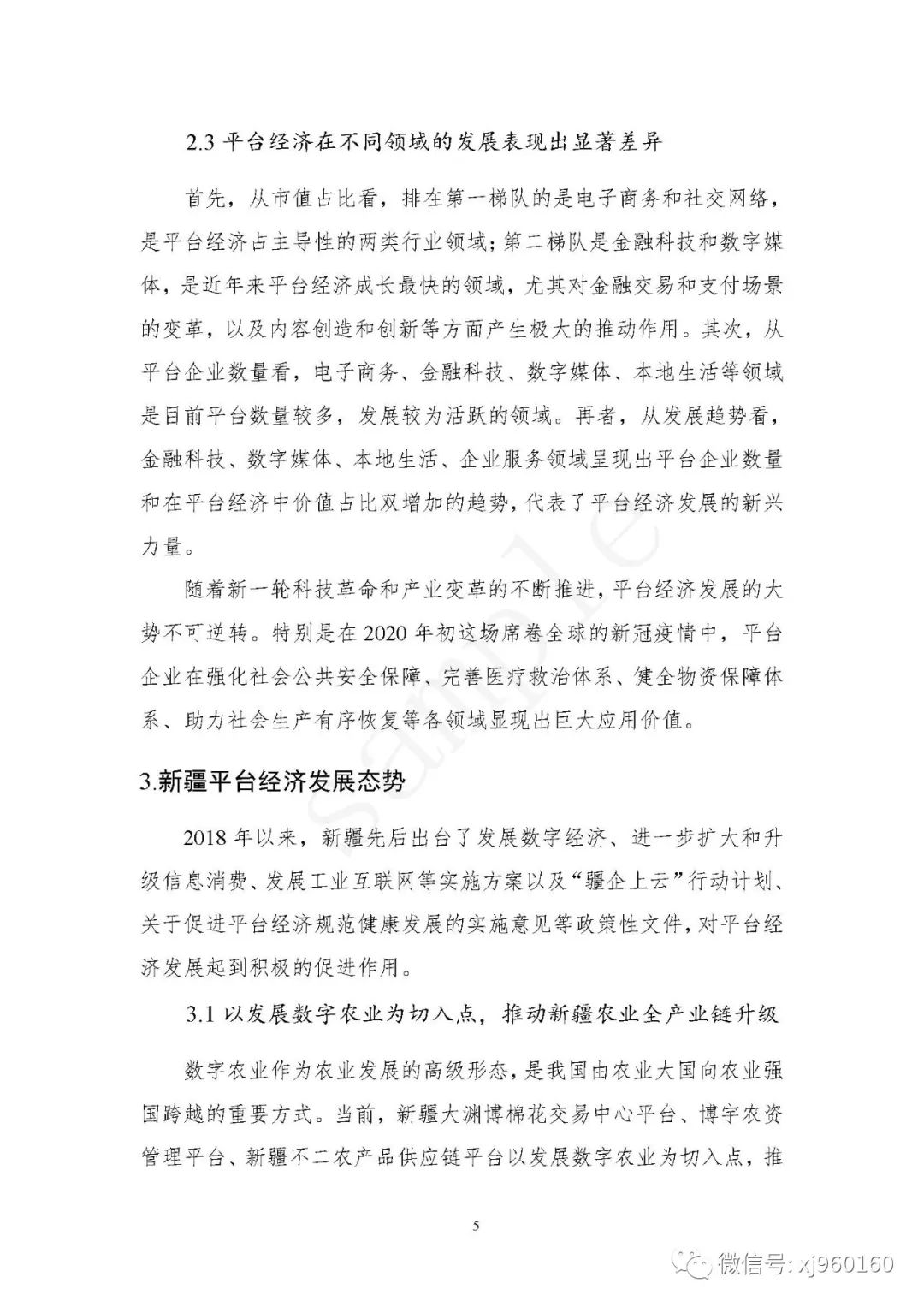 新疆数字经济研究课题组遴选出大渊博棉花交易中心平台、博宇农资管理平台、新疆不二农产品供应链平台、特变电工供应链平台、百成鲜食绿色供应链管理信息平台、微巴扎社群团购平台、乌鲁木齐国际陆港智能场站平台、乌鲁木齐丝路西大门保税直购平台、游新疆平台共9个平台开展为期 30 天的实地调研,撰写《新疆平台经济发展调研报告(2020)》,反映新疆平台经济发展现状、取得 成绩、存在问题,并提出对策建议。